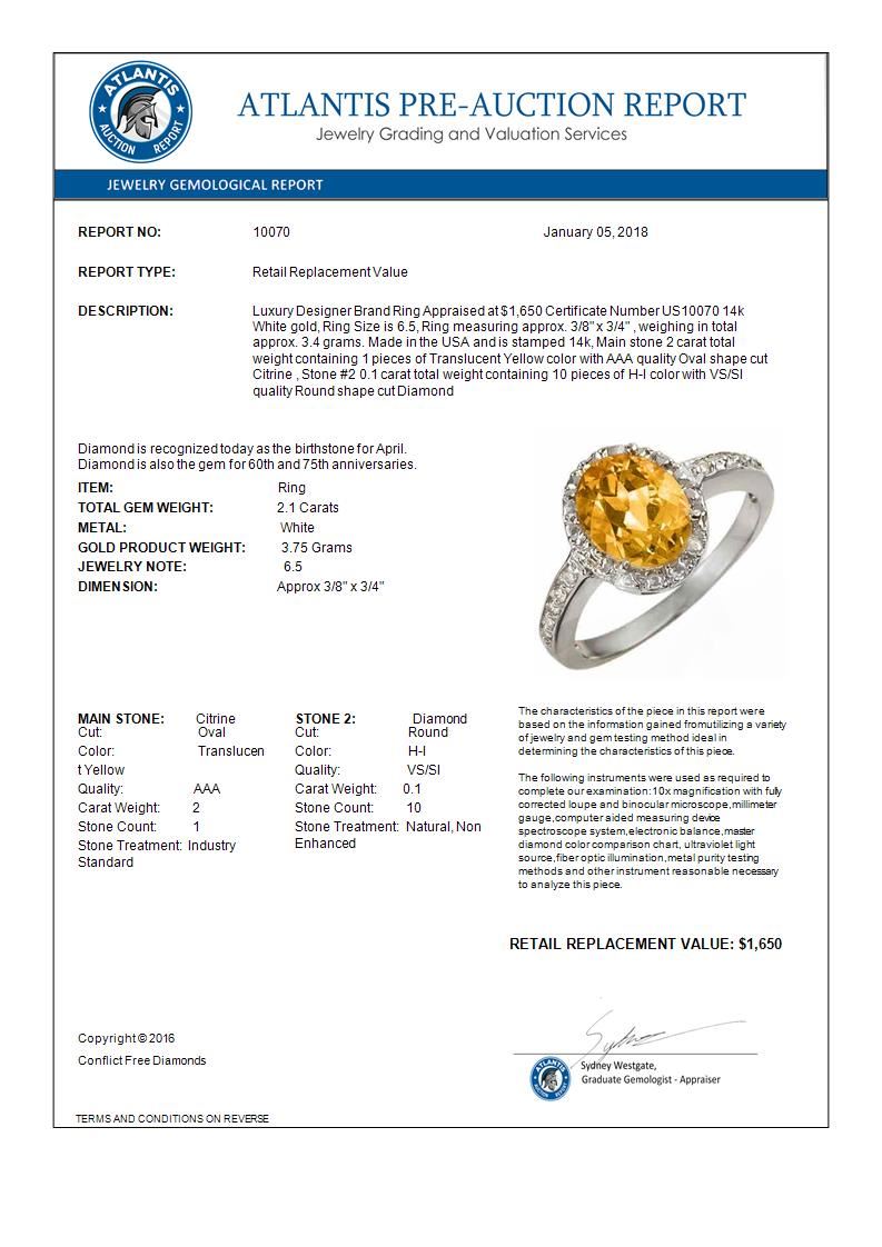 REF-27W6F -10070 ---- 2.10 CTW Citrine & Diamond Ring 14K White Gold ---- Luxury Designer Brand Ring Appraised at $1,650 Certificate Number US10070 14k White gold, Ring Size is 6.5, Ring measuring approx. 3/8" x 3/4" , weighing in total approx. 3.4 grams. Made in the USA and is stamped 14k, Main stone 2 carat total weight containing 1 pieces of Translucent Yellow color with AAA quality Oval shape cut Citrine , Stone #2 0.1 carat total weight containing 10 pieces of H-I color with VS/SI quality Round shape cut Diamond