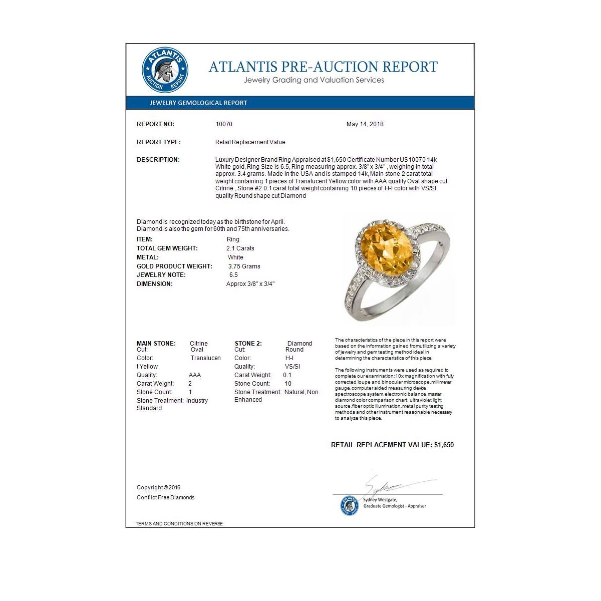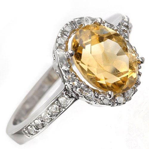 REF-27W6F -10070 ---- 2.10 CTW Citrine & Diamond Ring 14K White Gold ---- Luxury Designer Brand Ring Appraised at $1,650 Certificate Number US10070 14k White gold, Ring Size is 6.5, Ring measuring approx. 3/8" x 3/4" , weighing in total approx. 3.4 grams. Made in the USA and is stamped 14k, Main stone 2 carat total weight containing 1 pieces of Translucent Yellow color with AAA quality Oval shape cut Citrine , Stone #2 0.1 carat total weight containing 10 pieces of H-I color with VS/SI quality Round shape cut Diamond