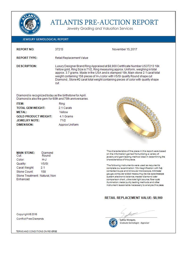 REF-161A8X -37213 ---- 2.10 CTW VS/SI Diamond Art Deco Eternity Eternity Ring 18K Yellow Gold ---- Luxury Designer Brand Ring Appraised at $8,900 Certificate Number US37213 18k Yellow gold, Ring Size is 71/2, Ring measuring approx. Uniform, weighing in total approx. 3.7 grams. Made in the USA and is stamped 18k, Main stone 2.1 carat total weight containing 158 pieces of H-J color with VS/SI quality Round shape cut Diamond , Stone #2 carat total weight containing pieces of color with quality shape cut