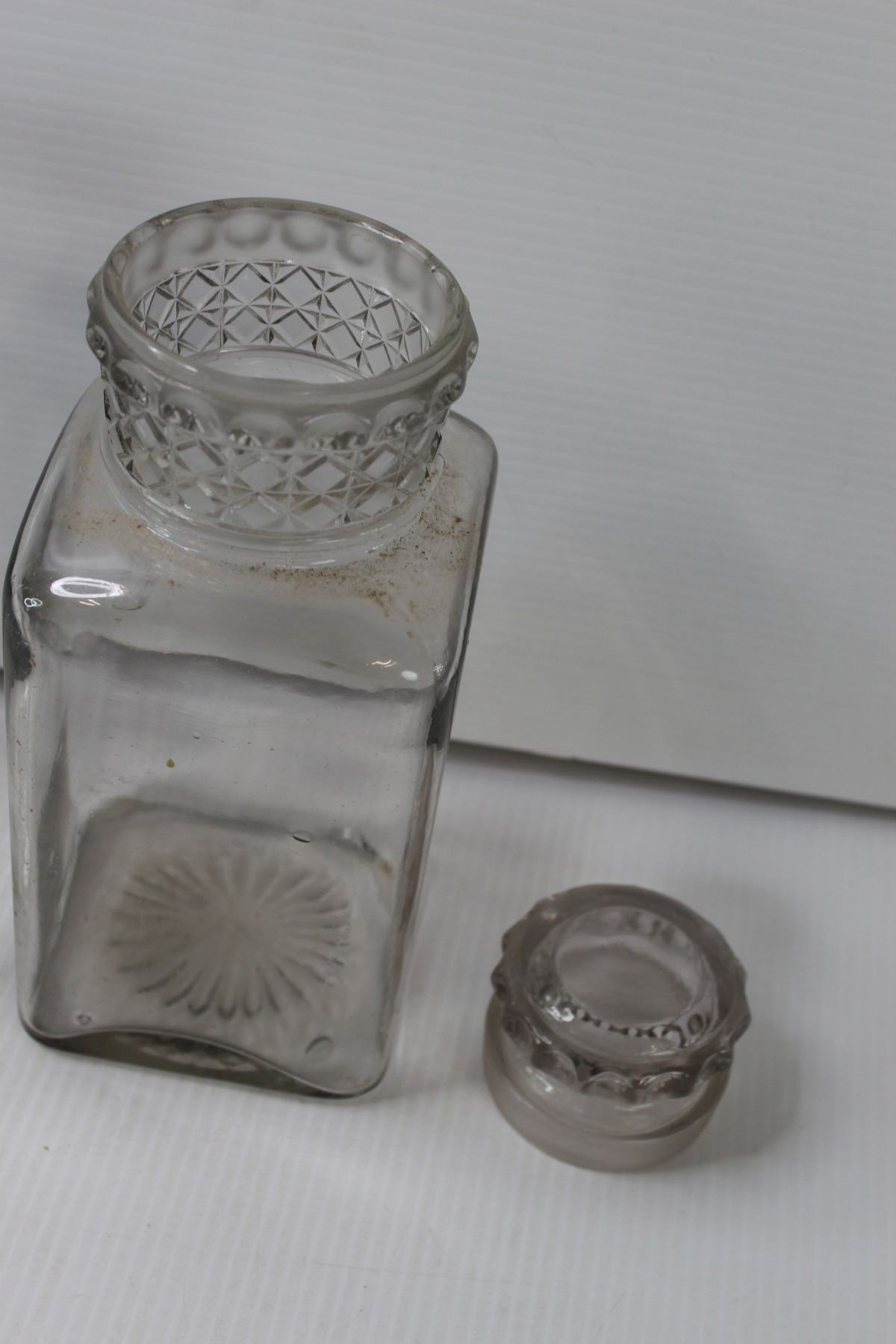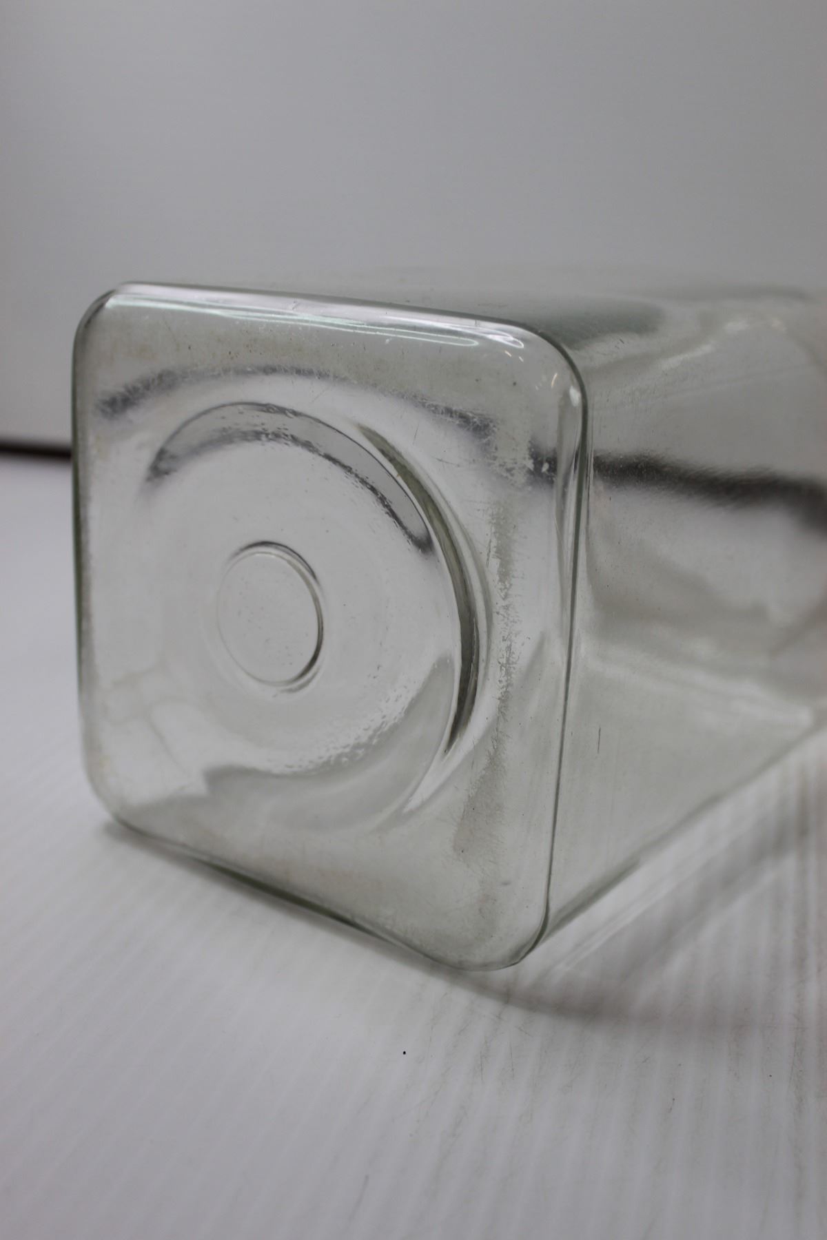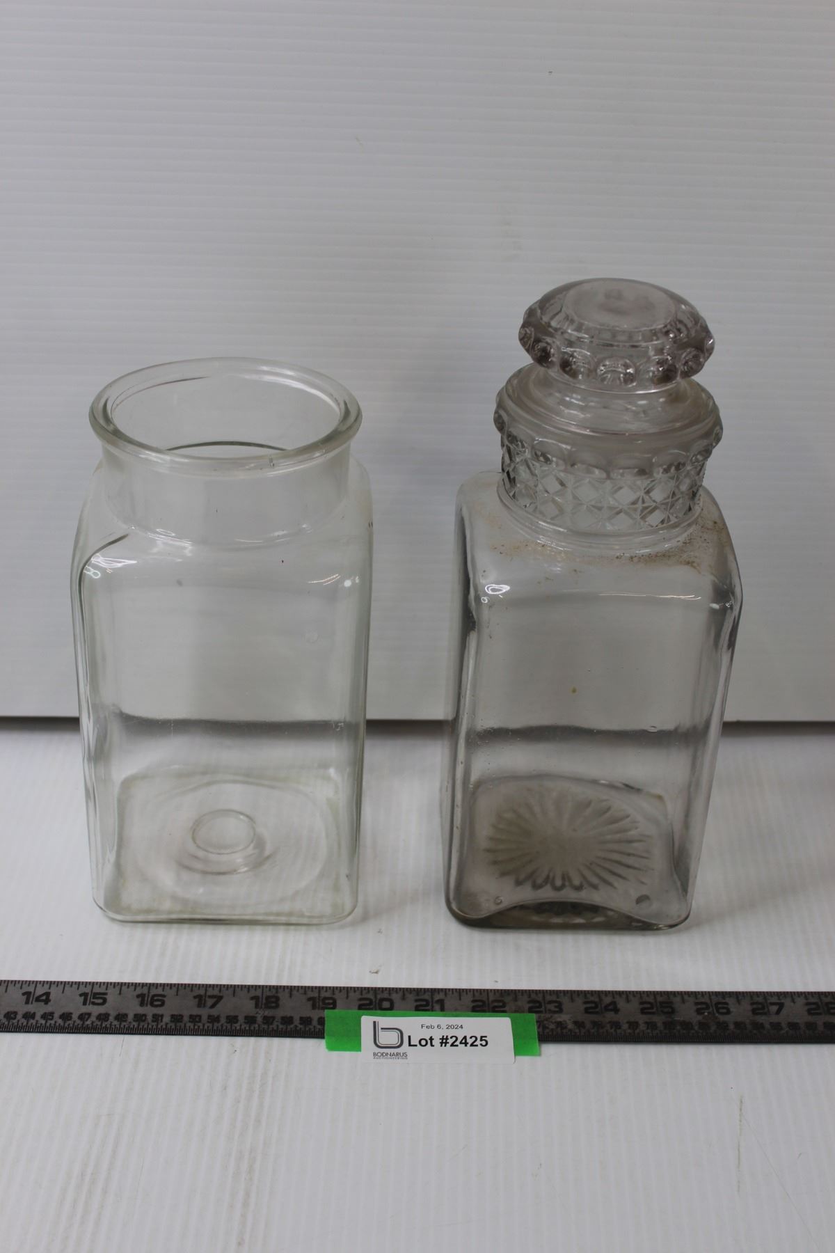 (2) 10" Clear Glass Candy Jars (One with no Lid, One w/Lid has Crack on Bottom As Pictured)