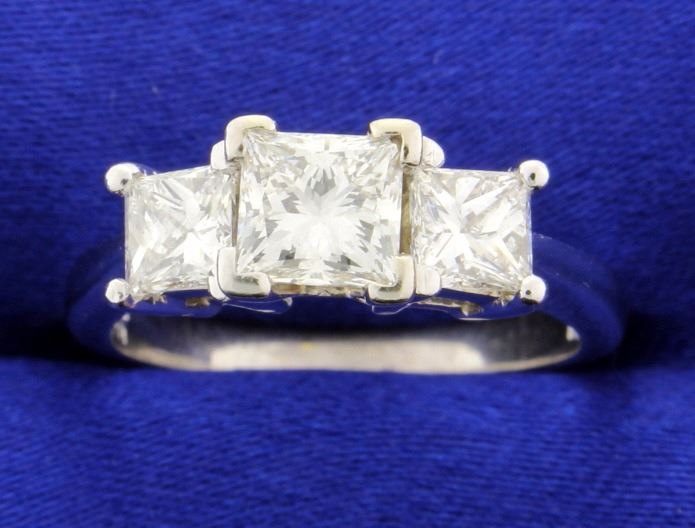 Magnificent 2.10 carat Princess cut three stone diamond ring set in 14k white gold.  The center is approximately 1.10 carats and the side Princess cut diamonds are approximately 1/2 carat each.  Clarity SI1 And color I-J.  This ring is in like new condition and has a stunning look!  Size 6 1/2  4.7g