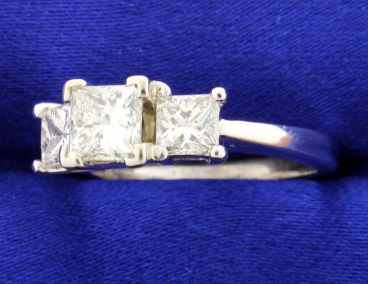 Magnificent 2.10 carat Princess cut three stone diamond ring set in 14k white gold. The center is approximately 1.10 carats and the side Princess cut diamonds are approximately 1/2 carat each. Clarity SI1 And color I-J. This ring is in like new condition and has a stunning look! Size 6 1/2 4.7g