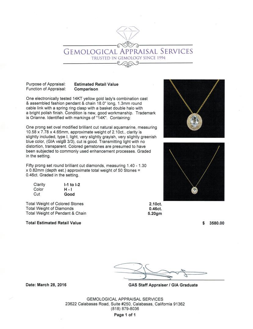 One electronically tested 14KT yellow gold lady's combination cast & assembled fashion pendant & chain 18.0" long, 1.3mm round cable link with a spring ring clasp with a basket double halo with a bright polish finish. Trademark is Orianne. Identified with markings of "14K". Condition is new, good workmanship. Containing: One prong set oval modified brilliant cut natural aquamarine, measuring 10.58 x 7.78 x 4.65mm, approximate weight of 2.10ct., clarity is slightly included, type I, light, very slightly grayish, very slightly greenish blue color, (GIA vslgB 3/3), cut is good. Transmitting light with no distortion, transparent. Colored gemstones are presumed to have been subjected to commonly used enhancement processes. Graded in the setting. Fifty prong set round brilliant cut diamonds, measuring 1.40 - 1.30 x 0.82mm (depth est.) approximate total weight of 50 Stones = 0.46ct. Graded in the setting. Clarity: I-1 to I-2. Color: H - I. Cut Good. Total Weight of Colored Stones 2.10ct. Total Weight of Diamonds 0.46ct. Total Weight of Pendant & Chain 5.20gm. GAS Appraised at $3,580.00.