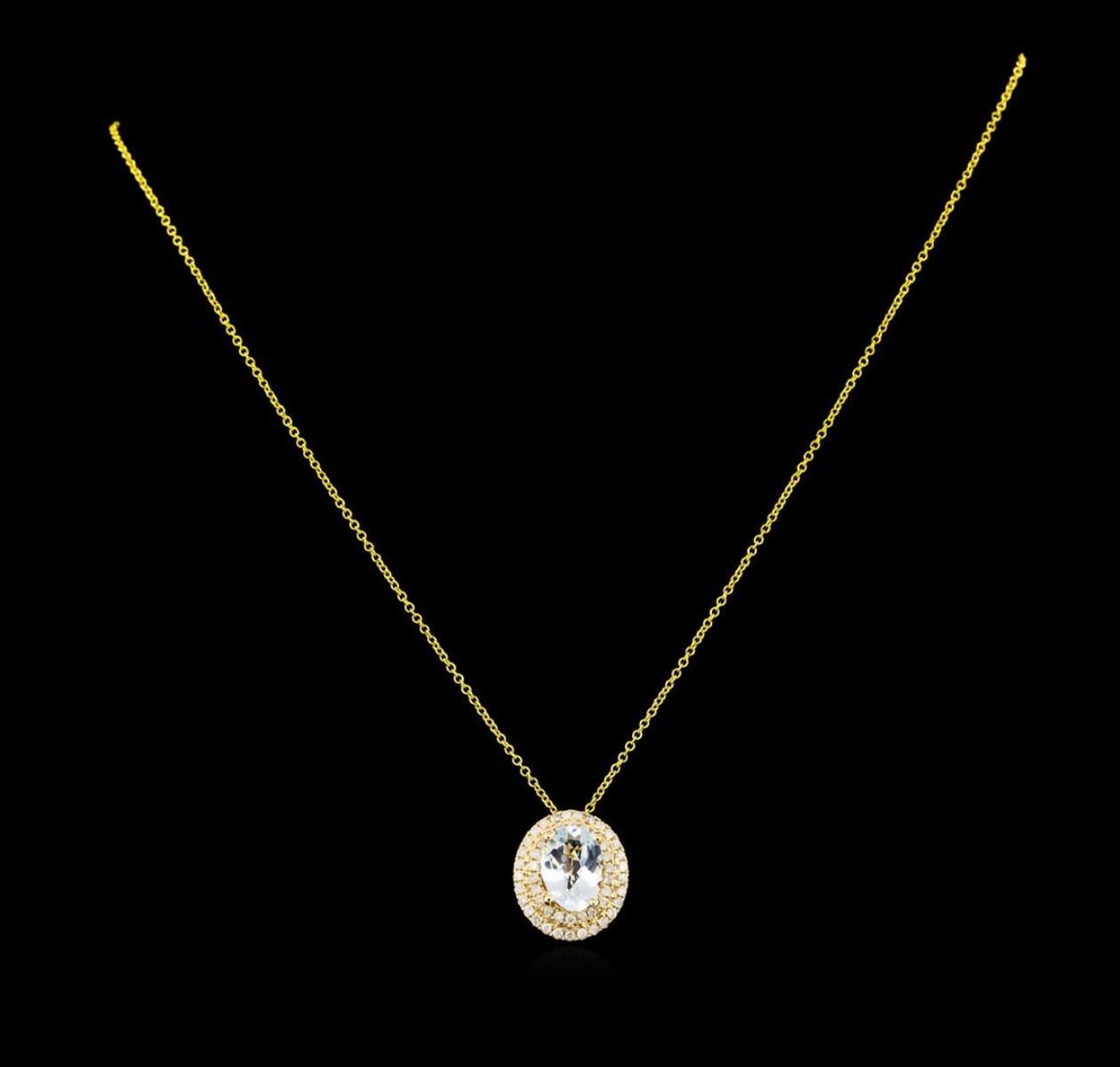One electronically tested 14KT yellow gold lady's combination cast & assembled fashion pendant & chain 18.0" long, 1.3mm round cable link with a spring ring clasp with a basket double halo with a bright polish finish. Trademark is Orianne. Identified with markings of "14K". Condition is new, good workmanship. Containing: One prong set oval modified brilliant cut natural aquamarine, measuring 10.58 x 7.78 x 4.65mm, approximate weight of 2.10ct., clarity is slightly included, type I, light, very slightly grayish, very slightly greenish blue color, (GIA vslgB 3/3), cut is good. Transmitting light with no distortion, transparent. Colored gemstones are presumed to have been subjected to commonly used enhancement processes. Graded in the setting. Fifty prong set round brilliant cut diamonds, measuring 1.40 - 1.30 x 0.82mm (depth est.) approximate total weight of 50 Stones = 0.46ct. Graded in the setting. Clarity: I-1 to I-2. Color: H - I. Cut Good. Total Weight of Colored Stones 2.10ct. Total Weight of Diamonds 0.46ct. Total Weight of Pendant & Chain 5.20gm. GAS Appraised.