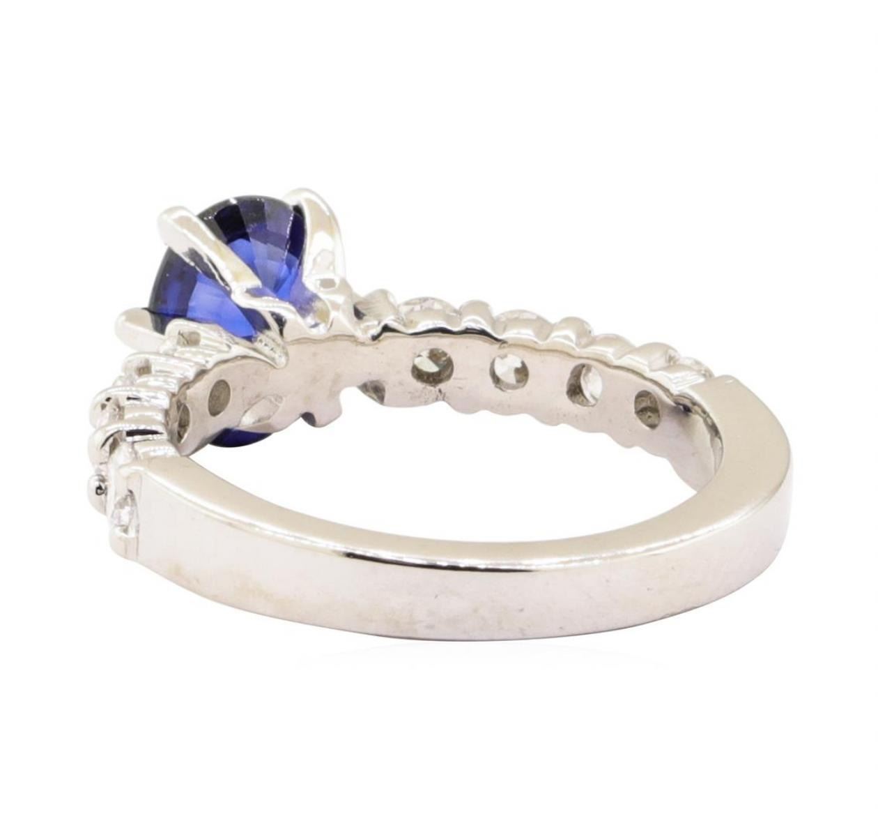 One electronically tested 14KT white gold lady's combination cast & assembled fashion ring with a straight line with a bright polish finish. The featured lady's ring has a shank measuring 2.60 millimeters wide. Identified with markings of '14K'. Condition is new, good workmanship. Containing: One prong set oval modified mixed cut natural blue sapphire, measuring 8.10 x 6.10 x 3.50mm, (depth est.) approximate weight of 1.45ct., clarity is slightly included, medium dark, moderately strong, blue color, (GIA B 6/4), cut is good. Transmitting light with a minimum of distortion, transparent. Colored gemstones are presumed to have been subjected to commonly used enhancement processes. Graded in the setting. Eight prong set round brilliant cut diamonds, measuring 2.80 - 2.75 x 1.72mm (depth est.) approximate total weight of 8 Stones = 0.65ct. Graded in the setting. Color G - H Clarity VS-1 to VS-2 Cut Very Good. Total Weight of Colored Stones 1.45ct.. Total Weight of Diamonds 0.65ct.. Total Weight of Ring 4.70gm GAS Appraised at $3920.00. GAS Appraised.