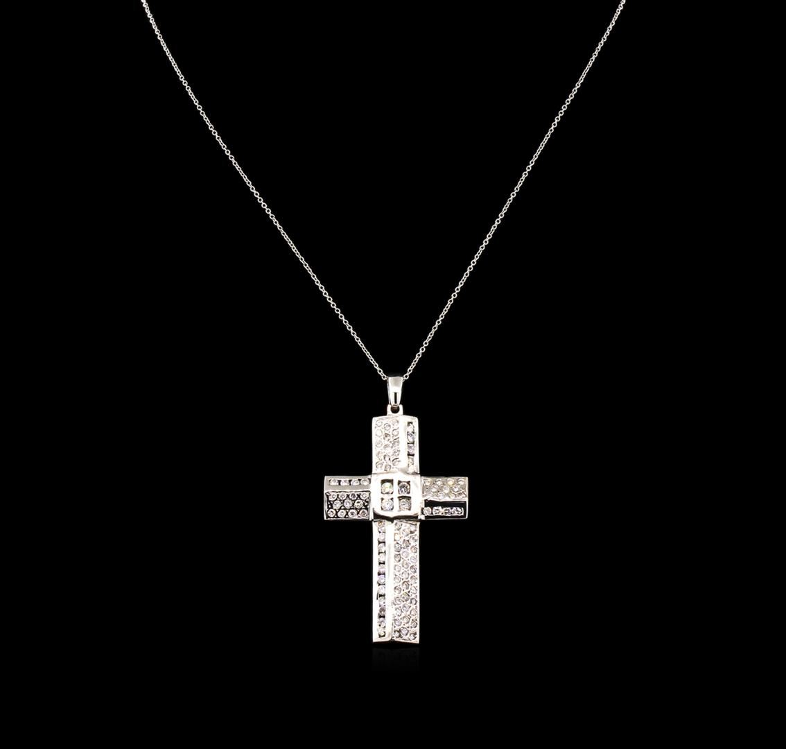 One electronically tested 14KT white gold lady's combination cast & assembled cross shape pendant & chain 16.0" long, 1mm cable link with a spring ring clasp with a bright polish finish. Identified with markings of "14K". Condition is new, good workmanship. Containing: Four channel set round brilliant cut diamonds, measuring 2.80 - 2.70 x 1.79mm (depth est.) approximate total weight of 4 Stones = 0.34ct. Graded in the setting. Clarity: I-1. Color: I - Good Twenty-Four channel set round brilliant cut diamonds, measuring 2.00 - 1.90 x 1.27mm (depth est.) approximate total weight of 24 Stones = 0.72ct. Graded in the setting. Clarity: SI-2 to I-1. Color: H - Good Sixty-Nine prong set round brilliant cut diamonds, measuring 1.60 - 1.50 x 1.01mm (depth est.) approximate total weight of 69 Stones = 1.04ct. Graded in the setting. Clarity: SI-2 to I-1. Color: H - Good. Total Weight of Diamonds 2.10ct. Total Weight of Pendant & Chain 22.00gm. GAS Appraised at $6,495.00.