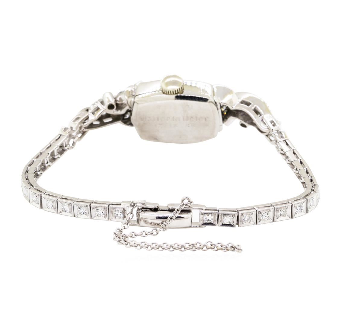 One lady's, combination cast & assembled Hamilton rectangular cushion case wrist watch electronically tested platinum, Serial#: 07555, Crown: pull-out, Crystal: domed acrylic, Movement: 17 jewel, Dial: eggshell baton, pointed type hands and stick and dot marker numerals, Bracelet: matching, Condition: G-6 extra fine. The attached bracelet has measures approximately six and a half inches in length and has an attached safety chain. The back of the case has been personalized with the engraving 'Walter to Helen 12-15-55'. Containing: Six prong set baguette cut diamonds, measuring from 2.95 x 2.00 x 1.70mm (depth est.) to 3.00 x 2.00 x 1.70mm (depth est.) approximate total weight of 6 Stones = 0.55ct. Graded in the setting. Color F - G Clarity VS-1 to VS-2 Cut Very Good Six prong set round brilliant cut diamonds, measuring 2.40 - 2.30 x 1.46mm (depth est.) approximate total weight of 6 Stones = 0.30ct. Graded in the setting. Color H - I Clarity VS-2 to SI-1 Cut Good Sixty-Two prong set single cut diamonds, measuring 1.90 - 1.60 x 1.09mm (depth est.) approximate total weight of 62 Stones = 1.25ct. Graded in the setting. Color F - G Clarity VS-1 to VS-2 Cut Very Good. Total Weight of Diamonds 2.10ct.. Total Weight of Watch 23.50gm GAS Appraised at $8885.00. GAS Appraised at $8,885.00.
