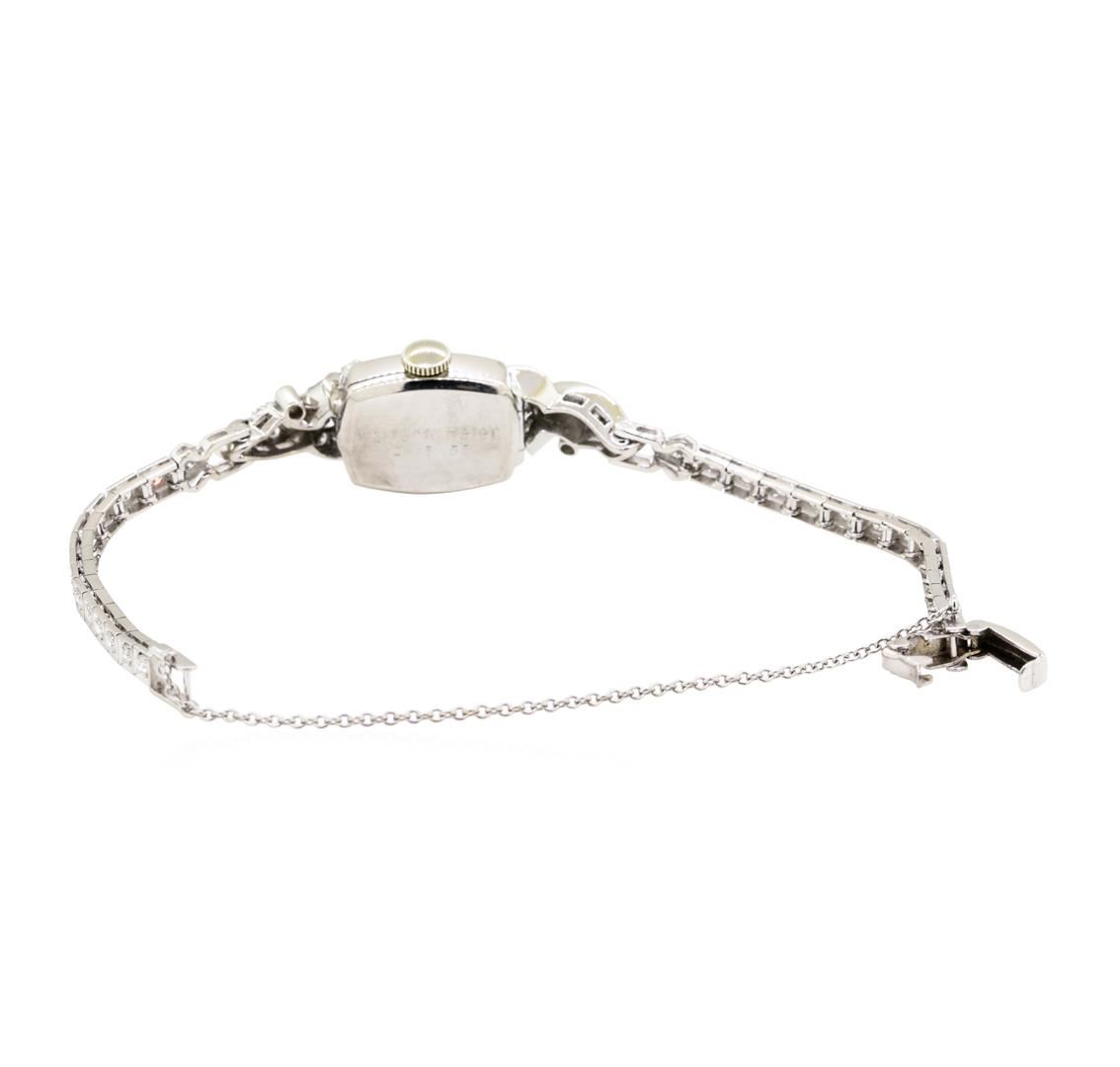 One lady's, combination cast & assembled Hamilton rectangular cushion case wrist watch electronically tested platinum, Serial#: 07555, Crown: pull-out, Crystal: domed acrylic, Movement: 17 jewel, Dial: eggshell baton, pointed type hands and stick and dot marker numerals, Bracelet: matching, Condition: G-6 extra fine. The attached bracelet has measures approximately six and a half inches in length and has an attached safety chain. The back of the case has been personalized with the engraving 'Walter to Helen 12-15-55'. Containing: Six prong set baguette cut diamonds, measuring from 2.95 x 2.00 x 1.70mm (depth est.) to 3.00 x 2.00 x 1.70mm (depth est.) approximate total weight of 6 Stones = 0.55ct. Graded in the setting. Color F - G Clarity VS-1 to VS-2 Cut Very Good Six prong set round brilliant cut diamonds, measuring 2.40 - 2.30 x 1.46mm (depth est.) approximate total weight of 6 Stones = 0.30ct. Graded in the setting. Color H - I Clarity VS-2 to SI-1 Cut Good Sixty-Two prong set single cut diamonds, measuring 1.90 - 1.60 x 1.09mm (depth est.) approximate total weight of 62 Stones = 1.25ct. Graded in the setting. Color F - G Clarity VS-1 to VS-2 Cut Very Good. Total Weight of Diamonds 2.10ct.. Total Weight of Watch 23.50gm GAS Appraised at $8885.00. GAS Appraised at $8,885.00.