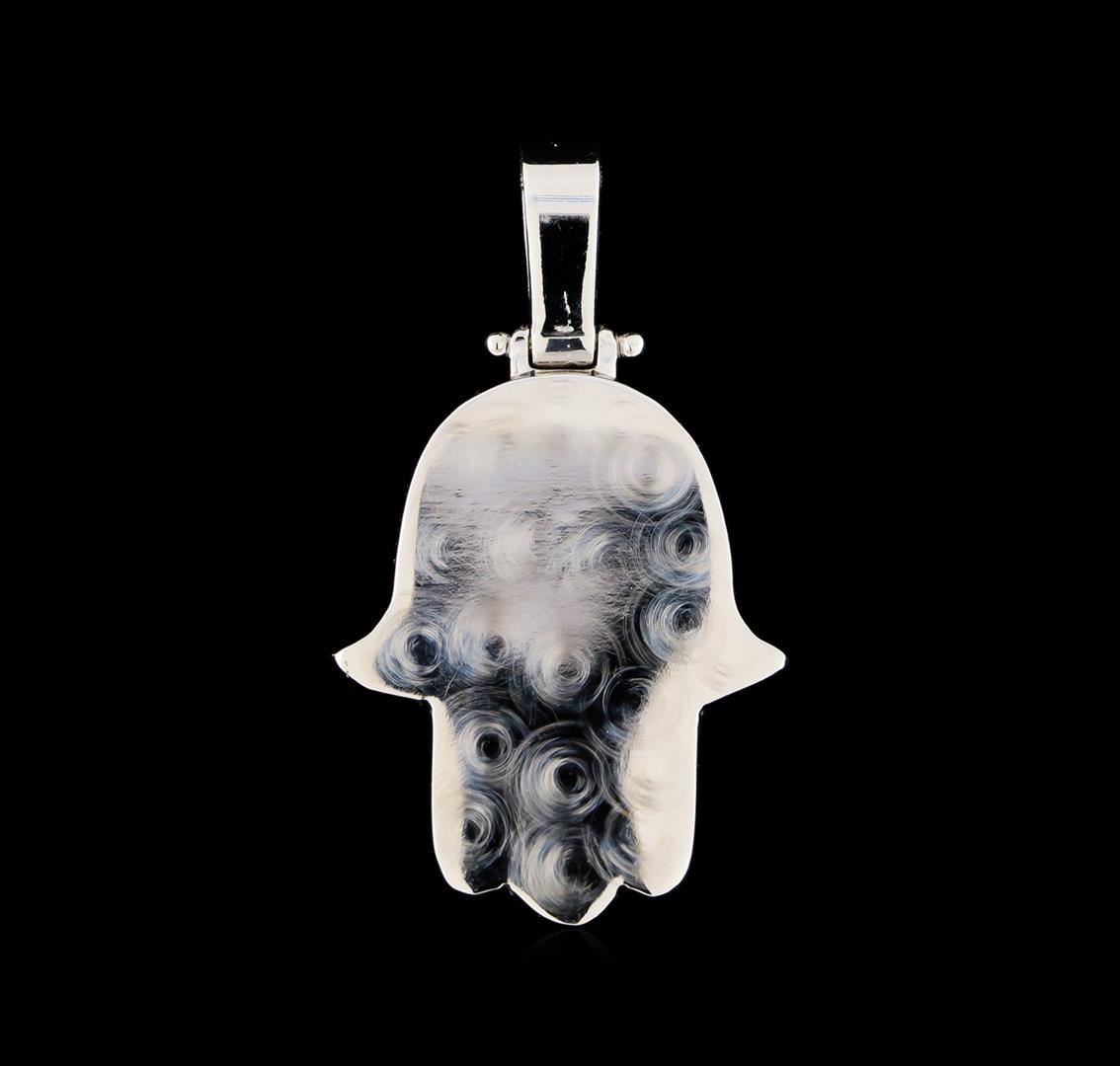 One electronically tested 14KT white gold cast & assembled diamond "hamsa" pendant with a bright polish finish. The pendant features a diamond encrusted hamsa motif, completed by a diamond set bail. Area measurements with bail 1.62 x 0.87 inch. In all faiths the hamsa is a protective sign. It is believed that wearing hamsa jewelry brings the owner happiness, luck, health, and good fortune. Condition is new, good workmanship. Containing: Twenty-Five prong set round brilliant cut diamonds, measuring 2.00 - 1.90 x 1.17mm (depth est.) approximate total weight of 25 Stones = 0.75ct. Graded in the setting. Clarity: I-1 to I-2. Color: G - I Twelve prong set round brilliant cut diamonds, measuring 1.70 - 1.60 x 0.99mm (depth est.) approximate total weight of 12 Stones = 0.24ct. Graded in the setting. Clarity: I-1 to I-2. Color: G - I One Hundred Forty-Three prong set round brilliant cut diamonds, measuring 1.30 - 1.20 x 0.75mm (depth est.) approximate total weight of 143 Stones = 1.11ct. Graded in the setting. Clarity: I-1 to I-2. Color: G - I. Total Weight of Diamonds 2.10ct. Total Weight of Pendant 13.39gm. AIG Appraised at $7,355.00.