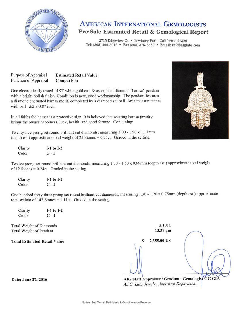 One electronically tested 14KT white gold cast & assembled diamond "hamsa" pendant with a bright polish finish. The pendant features a diamond encrusted hamsa motif, completed by a diamond set bail. Area measurements with bail 1.62 x 0.87 inch. In all faiths the hamsa is a protective sign. It is believed that wearing hamsa jewelry brings the owner happiness, luck, health, and good fortune. Condition is new, good workmanship. Containing: Twenty-Five prong set round brilliant cut diamonds, measuring 2.00 - 1.90 x 1.17mm (depth est.) approximate total weight of 25 Stones = 0.75ct. Graded in the setting. Clarity: I-1 to I-2. Color: G - I Twelve prong set round brilliant cut diamonds, measuring 1.70 - 1.60 x 0.99mm (depth est.) approximate total weight of 12 Stones = 0.24ct. Graded in the setting. Clarity: I-1 to I-2. Color: G - I One Hundred Forty-Three prong set round brilliant cut diamonds, measuring 1.30 - 1.20 x 0.75mm (depth est.) approximate total weight of 143 Stones = 1.11ct. Graded in the setting. Clarity: I-1 to I-2. Color: G - I. Total Weight of Diamonds 2.10ct. Total Weight of Pendant 13.39gm. AIG Appraised at $7,355.00.