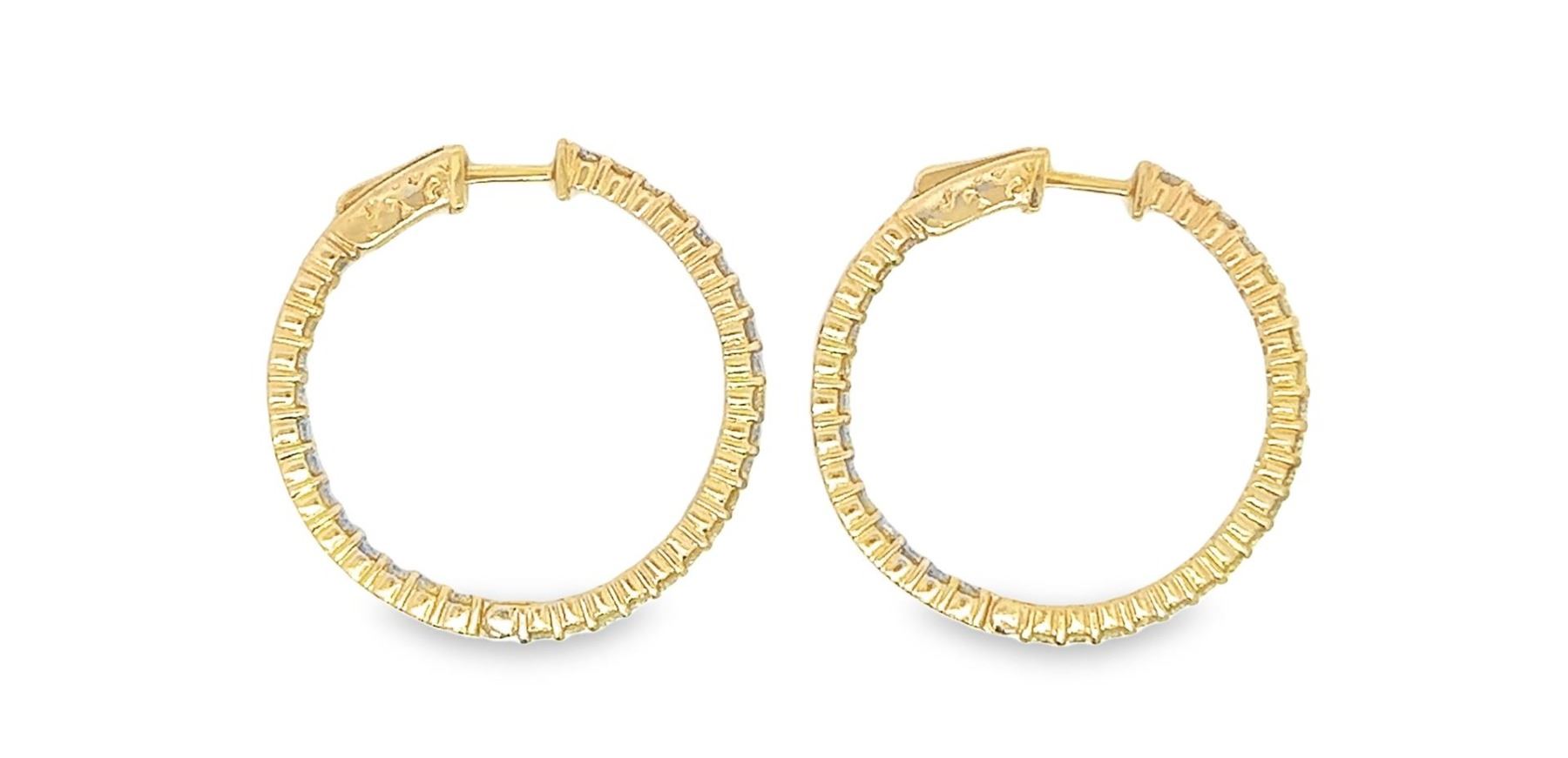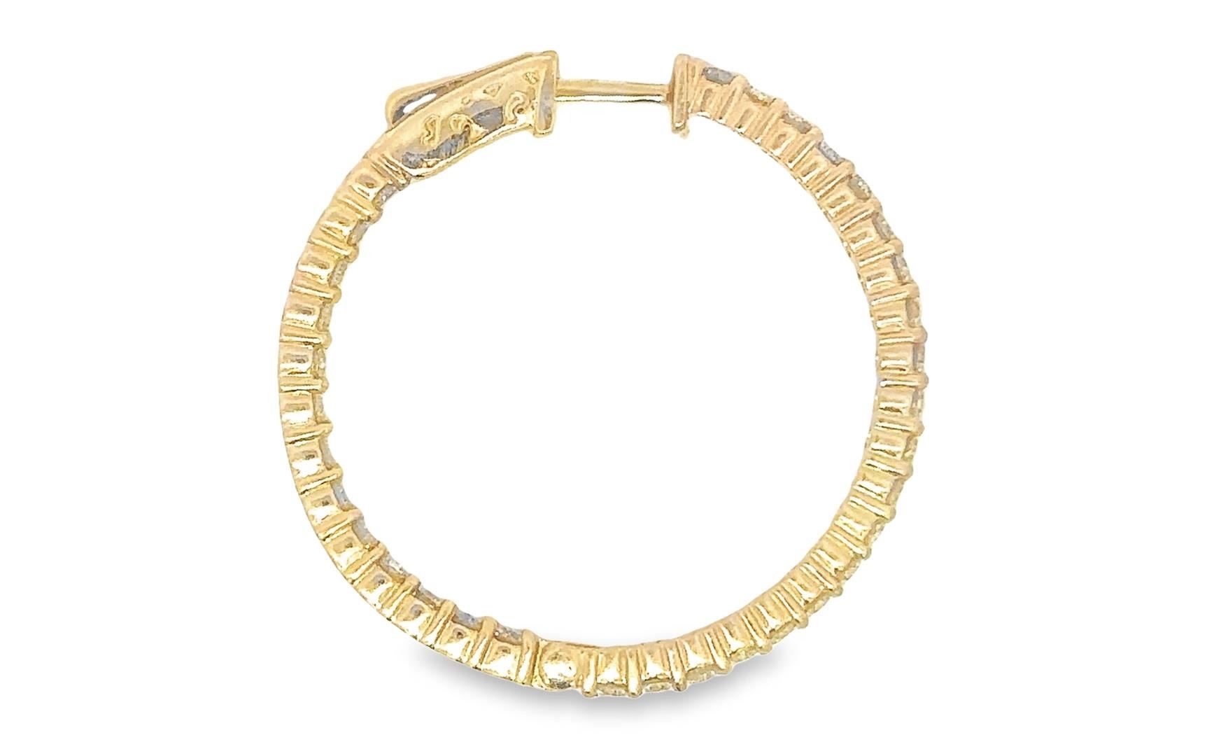 One pair electronically tested 14KT yellow gold lady's combination cast & assembled fashion inside-out hoop earrings with a bright polish finish. The featured hoop earring has a diameter of 30 millimeter. Identified with markings of "14K". Condition is new, good workmanship. Containing: Sixty-Six prong set round brilliant cut diamonds, measuring 2.00 - 1.95 x 1.28mm (depth est.) approximate total weight of 66 Stones = 2.10ct. Graded in the setting. Color I - K Clarity VS-2 to SI-1 Cut Very Good Total Weight of Diamonds 2.10ct. Total Weight of Earrings 7.70gm Estimated Retail Value $ 7550.00