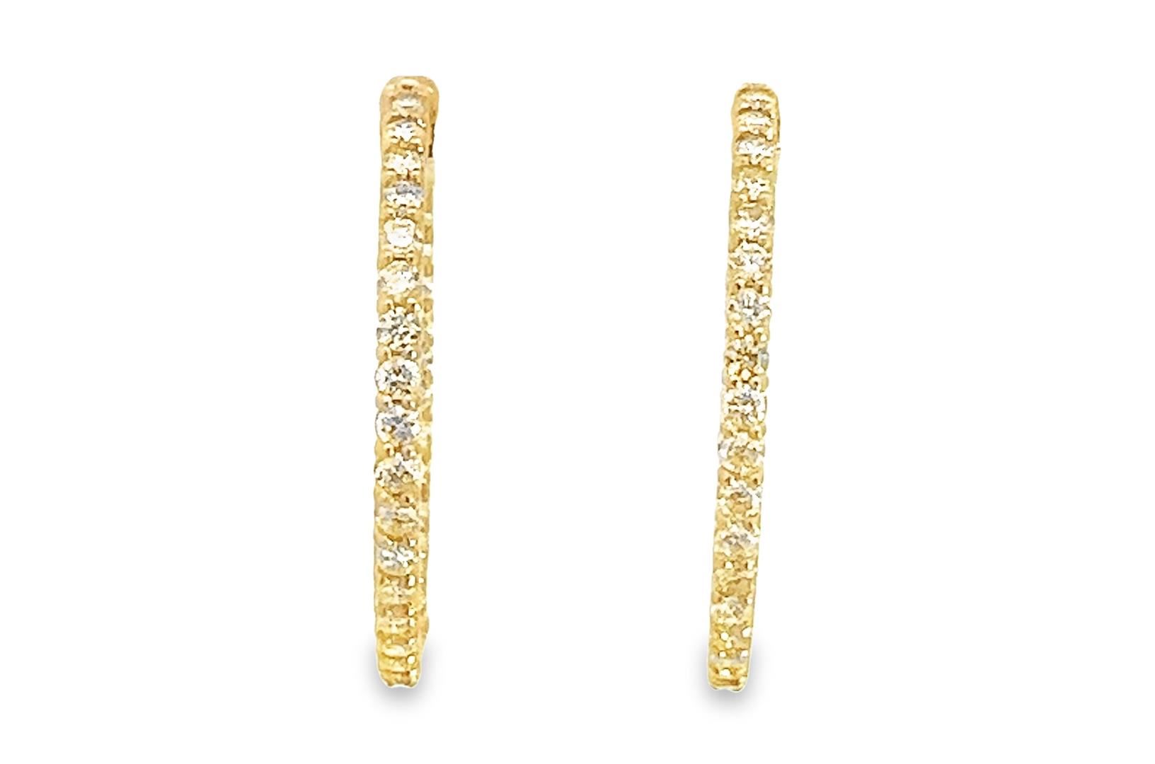 One pair electronically tested 14KT yellow gold lady's combination cast & assembled fashion inside-out hoop earrings with a bright polish finish. The featured hoop earring has a diameter of 30 millimeter. Identified with markings of "14K". Condition is new, good workmanship. Containing: Sixty-Six prong set round brilliant cut diamonds, measuring 2.00 - 1.95 x 1.28mm (depth est.) approximate total weight of 66 Stones = 2.10ct. Graded in the setting. Color I - K Clarity VS-2 to SI-1 Cut Very Good Total Weight of Diamonds 2.10ct. Total Weight of Earrings 7.70gm Estimated Retail Value $ 7550.00