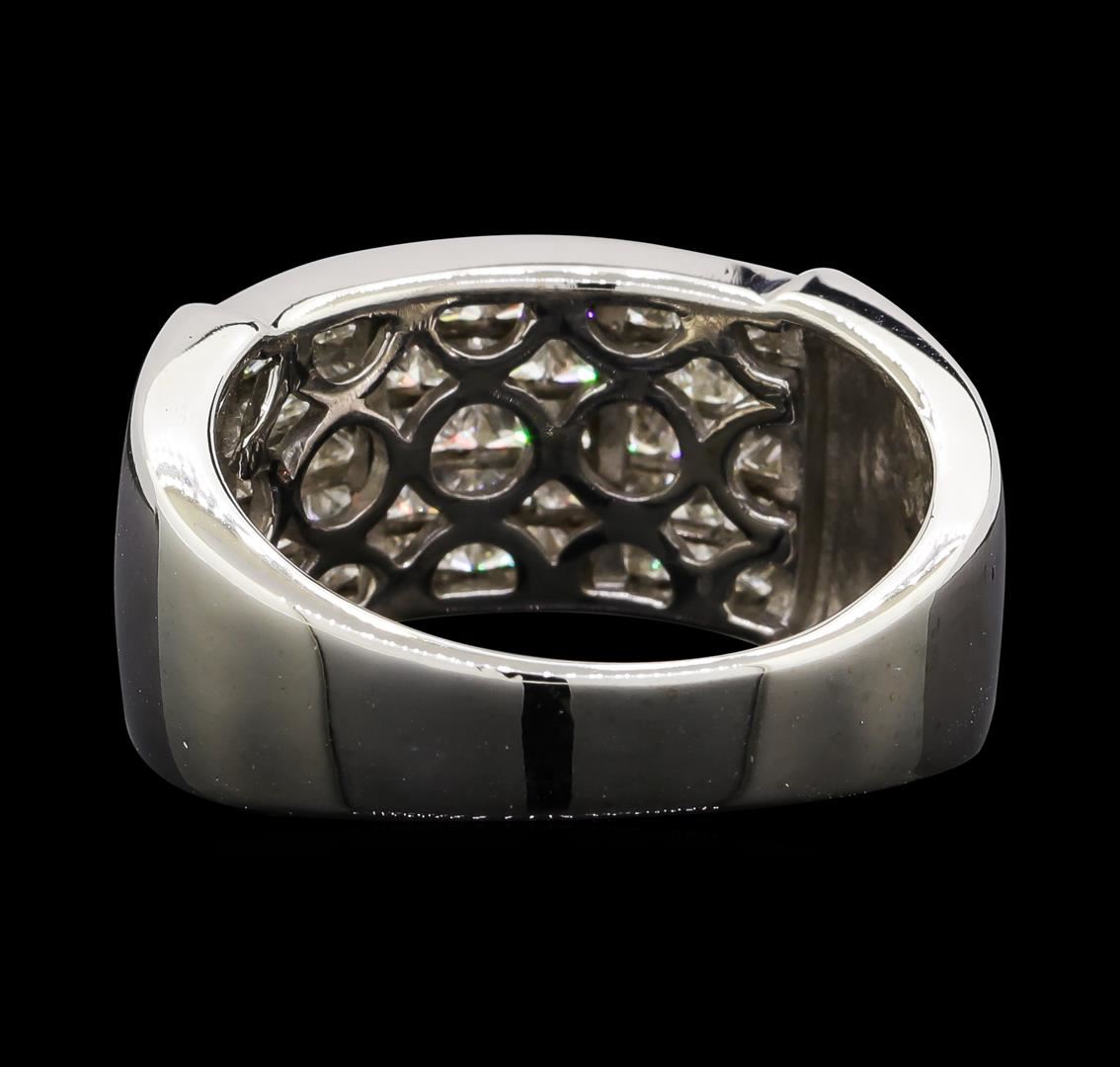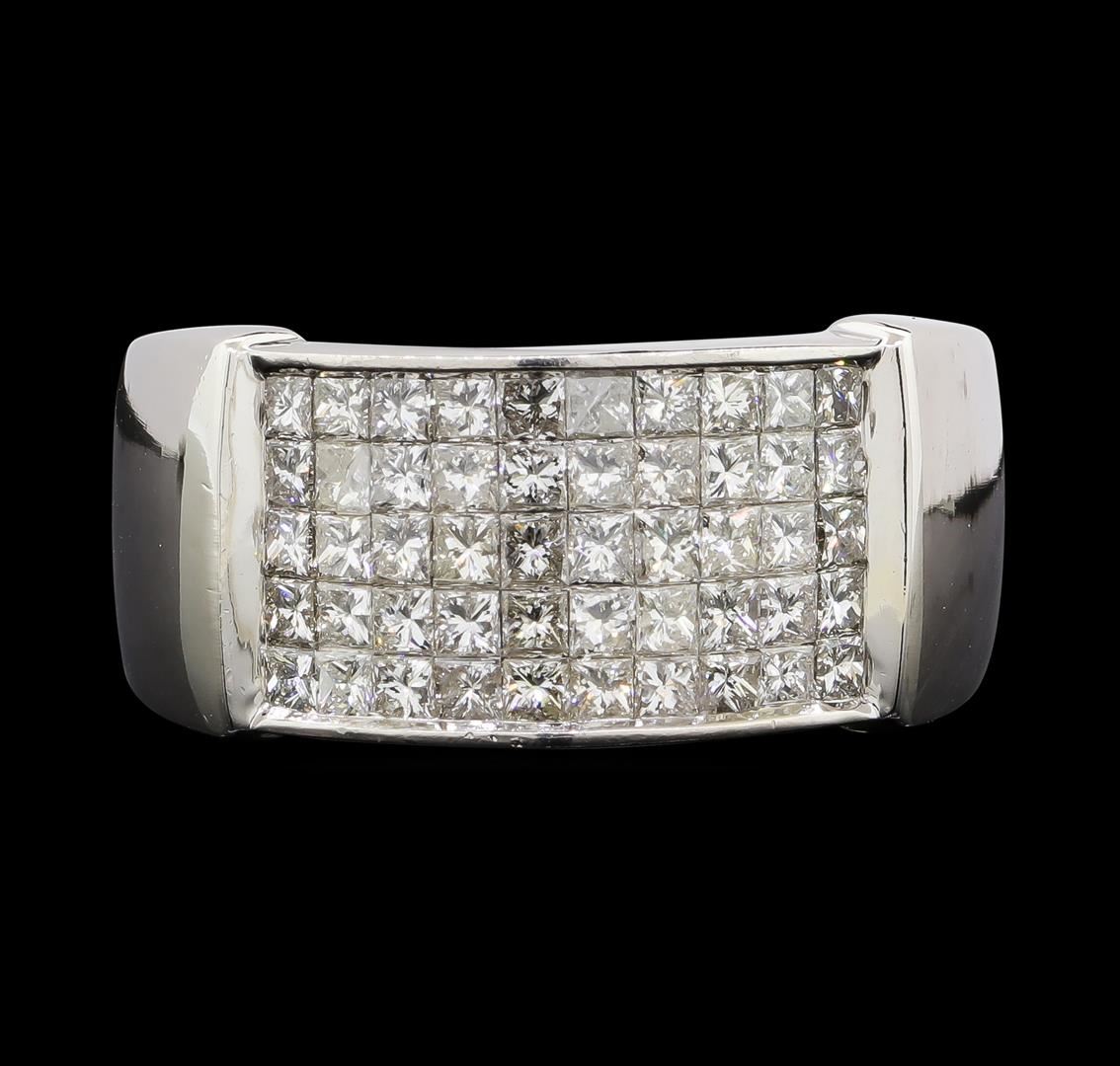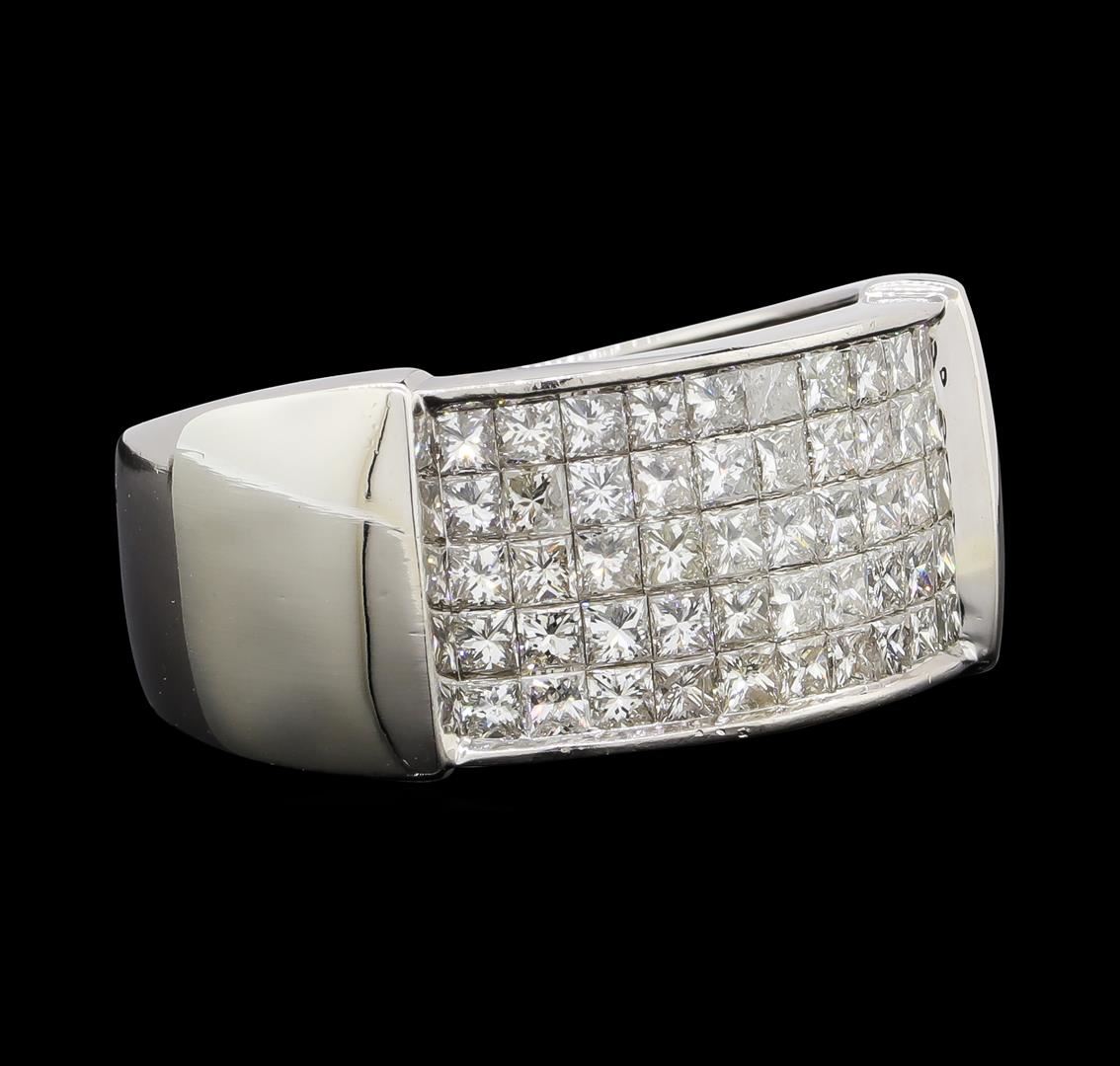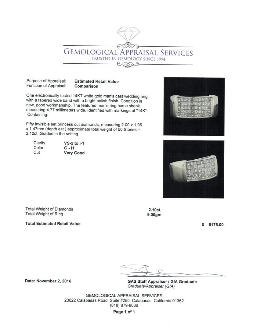 One electronically tested 14KT white gold man's cast wedding ring with a tapered wide band with a bright polish finish. The featured man's ring has a shank measuring 4.77 millimeters wide. Identified with markings of '14K'. Condition is new, good workmanship. Containing: Fifty invisible set princess cut diamonds, measuring 2.00 x 1.95 x 1.47mm (depth est.) approximate total weight of 50 Stones = 2.10ct. Graded in the setting. Clarity VS-2 to I-1. Color: G - H Cut Very Good. Total Weight of Diamonds 2.10ct.. Total Weight of Ring 9.00gm. GAS Appraised at $5,175.00.