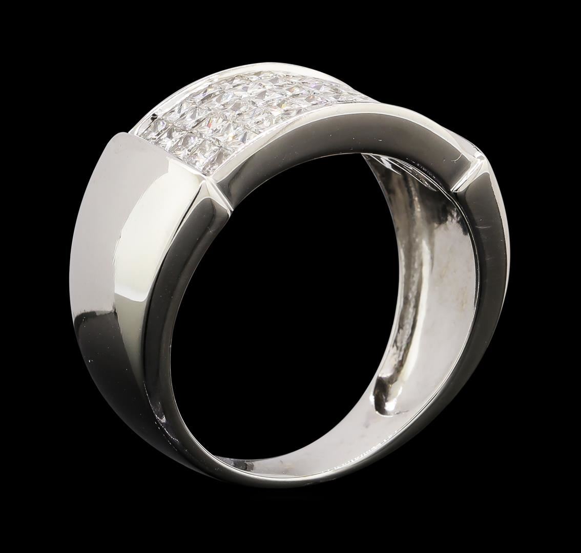 One electronically tested 14KT white gold man's cast wedding ring with a tapered wide band with a bright polish finish. The featured man's ring has a shank measuring 4.77 millimeters wide. Identified with markings of '14K'. Condition is new, good workmanship. Containing: Fifty invisible set princess cut diamonds, measuring 2.00 x 1.95 x 1.47mm (depth est.) approximate total weight of 50 Stones = 2.10ct. Graded in the setting. Clarity VS-2 to I-1. Color: G - H Cut Very Good. Total Weight of Diamonds 2.10ct.. Total Weight of Ring 9.00gm. GAS Appraised at $5,175.00.