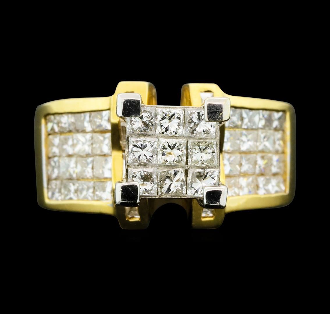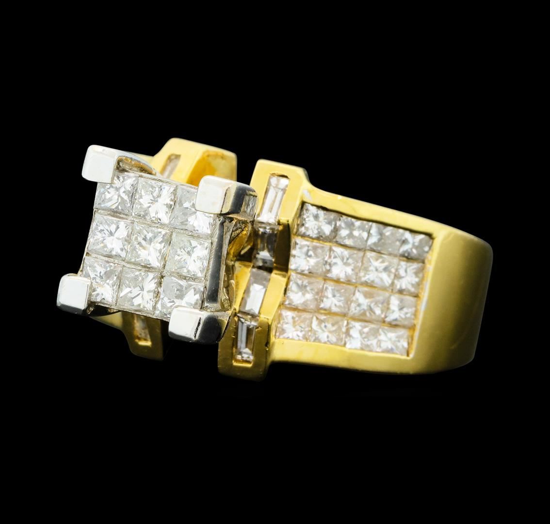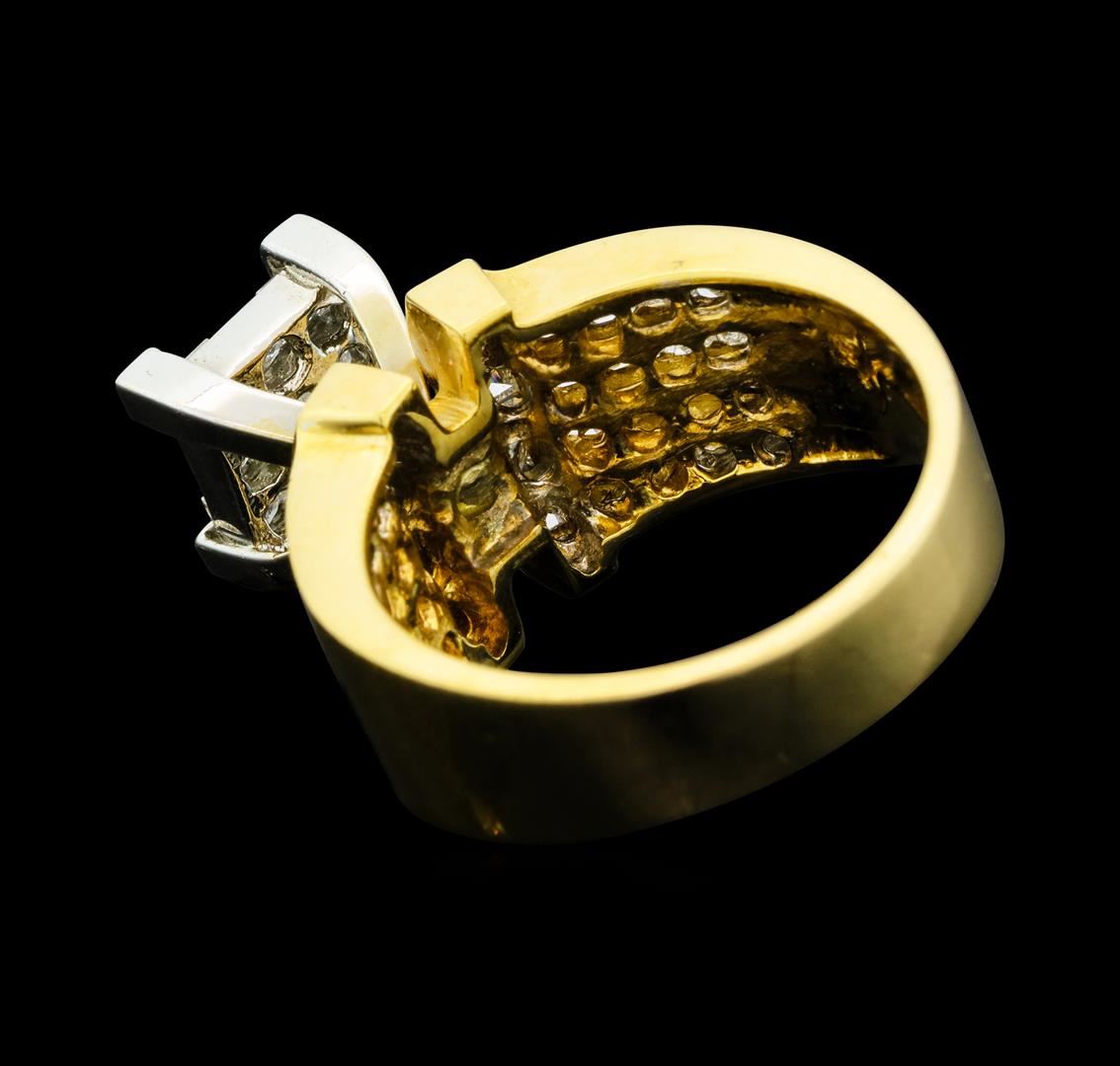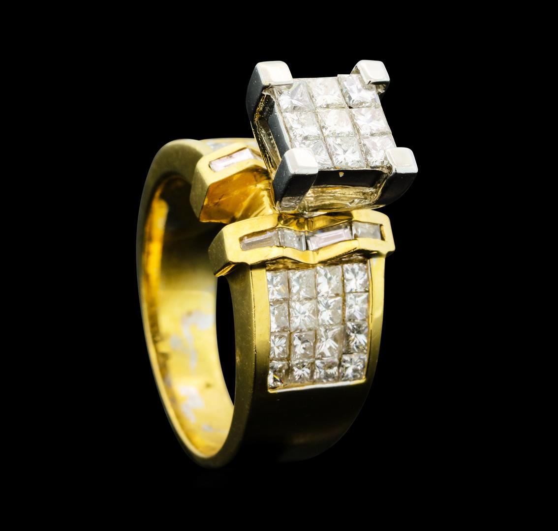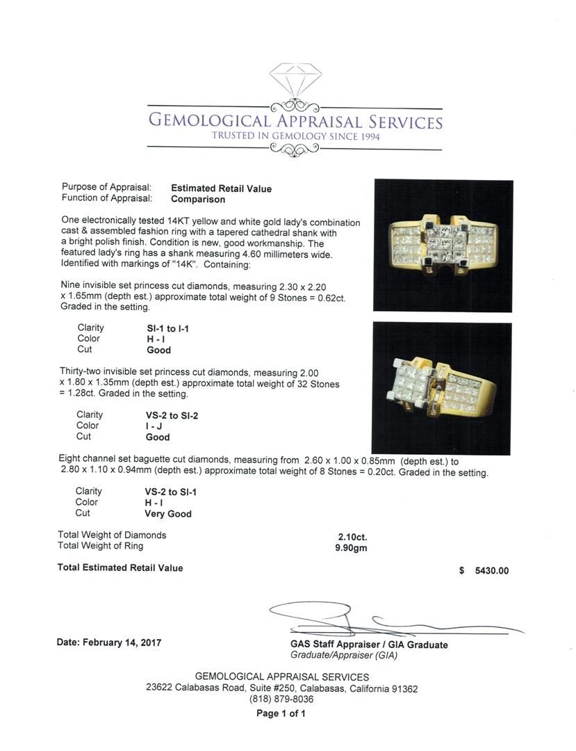 One electronically tested 14KT yellow and white gold lady's combination cast & assembled fashion ring with a tapered cathedral shank with a bright polish finish. The featured lady's ring has a shank measuring 4.60 millimeters wide. Identified with markings of '14K'. Condition is new, good workmanship. Containing: Nine invisible set princess cut diamonds, measuring 2.30 x 2.20 x 1.65mm (depth est.) approximate total weight of 9 Stones = 0.62ct. Graded in the setting. Clarity SI-1 to I-1. Color: H - I Cut Good Thirty-Two invisible set princess cut diamonds, measuring 2.00 x 1.80 x 1.35mm (depth est.) approximate total weight of 32 Stones = 1.28ct. Graded in the setting. Clarity VS-2 to SI-2. Color: I - J Cut Good Eight channel set baguette cut diamonds, measuring from 2.60 x 1.00 x 0.85mm (depth est.) to 2.80 x 1.10 x 0.94mm (depth est.) approximate total weight of 8 Stones = 0.20ct. Graded in the setting. Clarity VS-2 to SI-1. Color: H - I Cut Very Good. Total Weight of Diamonds 2.10ct.. Total Weight of Ring 9.90gm. GAS Appraised at $5,430.00.