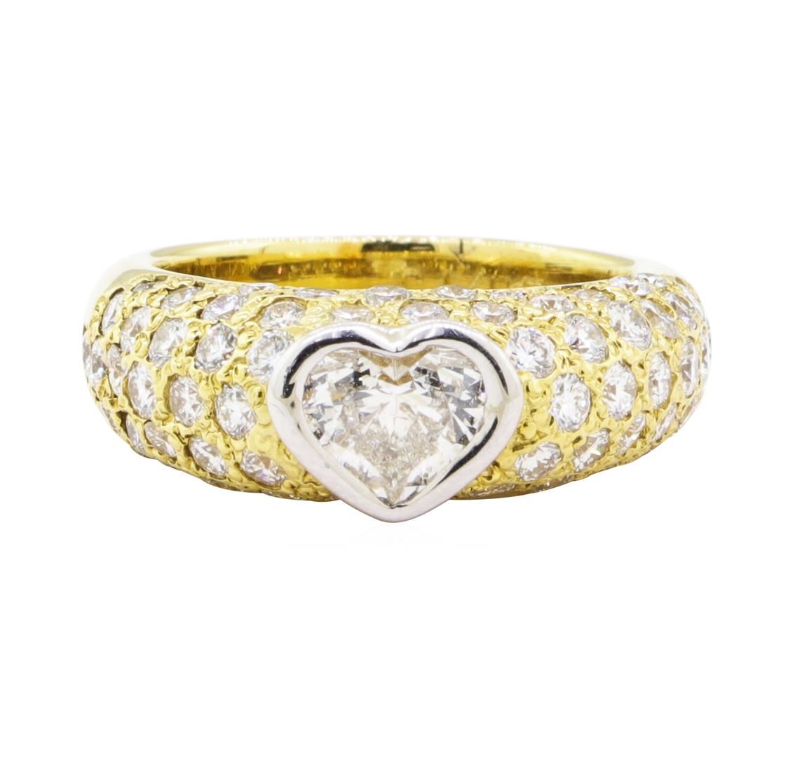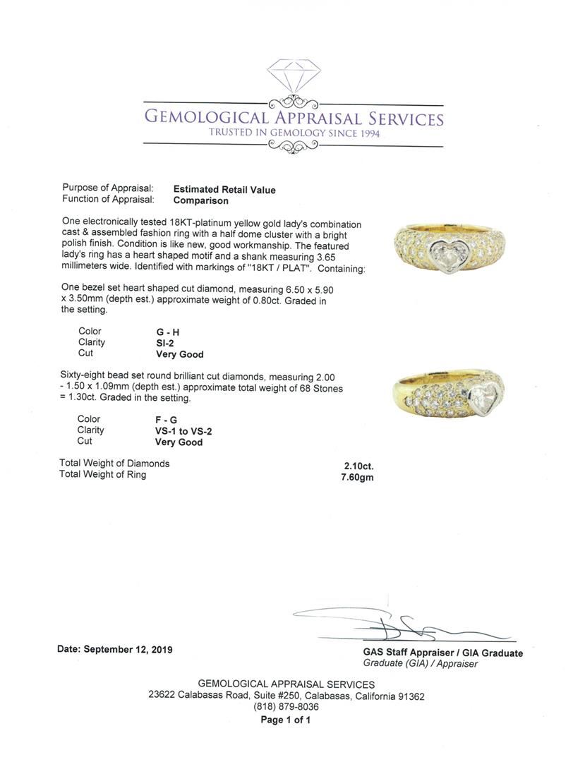 One electronically tested 18KT-platinum yellow gold lady's combination cast & assembled fashion ring with a half dome cluster with a bright polish finish. The featured lady's ring has a heart shaped motif and a shank measuring 3.65 millimeters wide. Identified with markings of '18KT / PLAT'. Condition is Good. Containing: One bezel set heart shaped cut diamond, measuring 6.50 x 5.90 x 3.50mm (depth est.) approximate weight of 0.80ct. Graded in the setting. Color G - H Clarity SI-2 Cut Very Good Sixty-Eight bead set round brilliant cut diamonds, measuring 2.00 - 1.50 x 1.09mm (depth est.) approximate total weight of 68 Stones = 1.30ct. Graded in the setting. Color F - G Clarity VS-1 to VS-2 Cut Very Good. Total Weight of Diamonds 2.10ct.. Total Weight of Ring 7.60gm GAS Appraised at $10715.00. GAS Appraised.