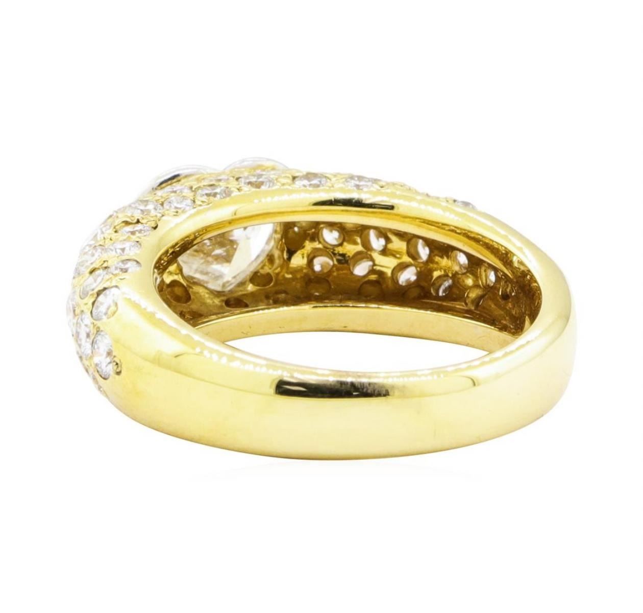 One electronically tested 18KT-platinum yellow gold lady's combination cast & assembled fashion ring with a half dome cluster with a bright polish finish. The featured lady's ring has a heart shaped motif and a shank measuring 3.65 millimeters wide. Identified with markings of '18KT / PLAT'. Condition is Good. Containing: One bezel set heart shaped cut diamond, measuring 6.50 x 5.90 x 3.50mm (depth est.) approximate weight of 0.80 ct. Graded in the setting. Color G - H Clarity SI-2 Cut Very Good Sixty-Eight bead set round brilliant cut diamonds, measuring 2.00 - 1.50 x 1.09mm (depth est.) approximate total weight of 68 Stones = 1.30 ct. Graded in the setting. Color F - G Clarity VS-1 to VS-2 Cut Very Good. Total Weight of Diamonds 2.10 ct.. Total Weight of Ring 7.60gm GAS Appraised at $10715.00. GAS Appraised.