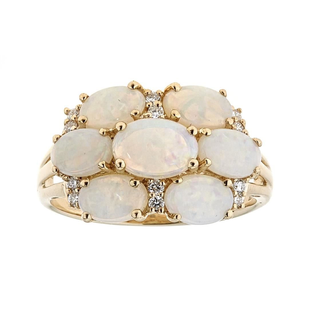 One Lady's Opal and Diamond Ring. Setting: 14 KT. Yellow Gold Mounting. Additional: 12 Round Diamonds = 0.12 Cts. TWT (G-H/SI). Center Gem Stone Information: Species: Natural Opal. Variety: White Opal. Shape and Cut: Cabochon. Measurements: Assorted. Weight: 7 = 2.10 Carats TW. Transparency: Translucent. Color Hue: White with Play of Color. Saturation: Light. Total Weight: 3.32 grams.