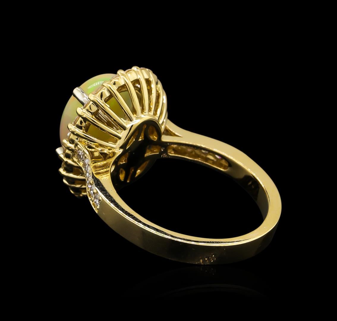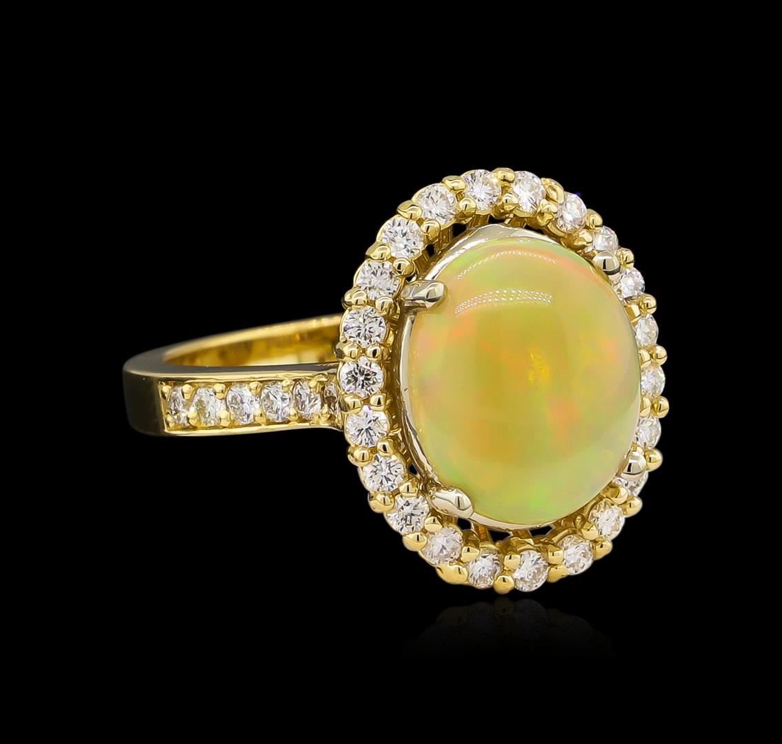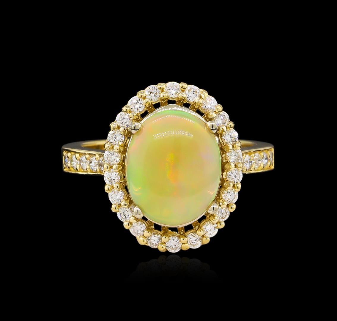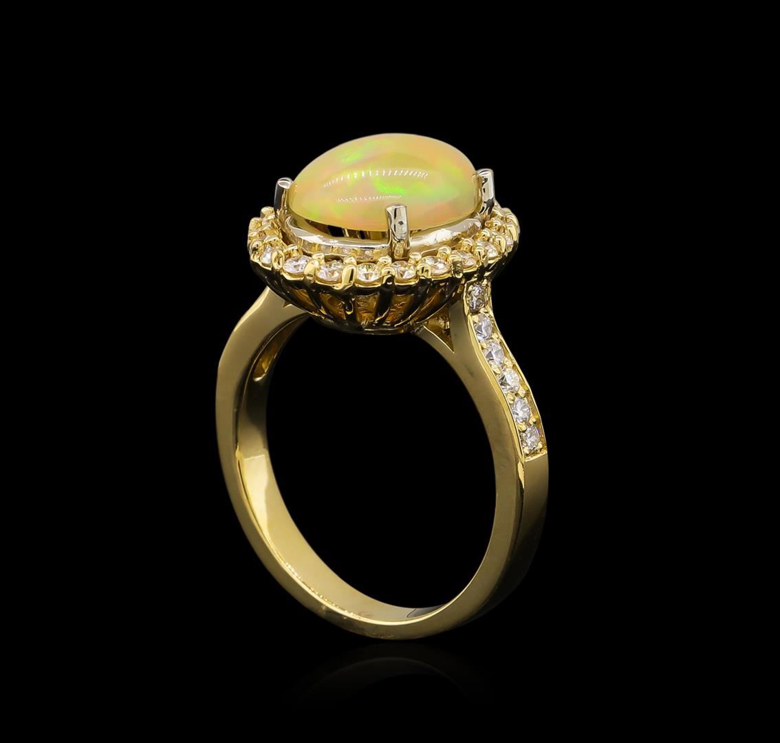 One ring featuring: 14KT yellow gold weighing 5.77 grams containing one opal with a total weight of 2.10ct and side diamonds with a total weight of 0.58ct.