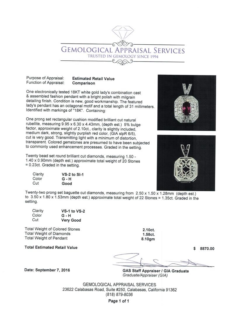 One electronically tested 18KT white gold lady's combination cast & assembled fashion pendant with a bright polish with milgrain detailing finish. The featured lady's pendant has an octagonal motif and a total length of 31 millimeters. Identified with markings of '18K'. Condition is new, good workmanship. Containing: One prong set rectangular cushion modified brilliant cut natural rubellite, measuring 9.95 x 6.30 x 4.43mm, (depth est.) 5%. bulge factor, approximate weight of 2.10ct., clarity is slightly included, medium dark, strong, slightly purplish red color, (GIA slpR 6/5), cut is very good. Transmitting light with a minimum of distortion, transparent. Colored gemstones are presumed to have been subjected to commonly used enhancement processes. Graded in the setting. Twenty bead set round brilliant cut diamonds, measuring 1.50 - 1.40 x 0.90mm (depth est.) approximate total weight of 20 Stones = 0.23ct. Graded in the setting. Clarity VS-2 to SI-1. Color: G - H Cut Good Twenty-Two prong set baguette cut diamonds, measuring from 2.50 x 1.50 x 1.28mm (depth est.) to 3.50 x 1.80 x 1.53mm (depth est.) approximate total weight of 22 Stones = 1.35ct. Graded in the setting. Clarity VS-1 to VS-2. Color: G - H Cut Very Good. Total Weight of Colored Stones 2.10ct.. Total Weight of Diamonds 1.58ct.. Total Weight of Pendant 8.10gm GAS Appraised at $8,870.00.