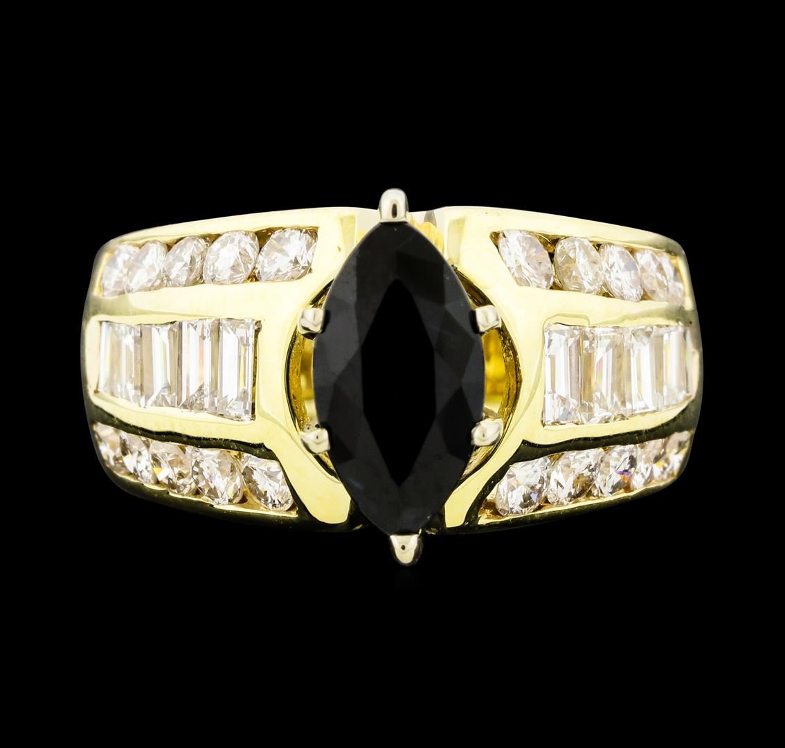 One electronically tested 14KT yellow gold lady's cast fashion ring with a tapered cathedral shank with a bright polish finish. The featured lady's ring has a shank measuring 5.31 millimeters wide. Identified with markings of '14K'. Condition is new, good workmanship. Containing: One prong set marquise modified mixed cut natural blue sapphire, measuring 10.65 x 5.77 x 4.50mm, (depth est.) approximate weight of 2.10ct., clarity is slightly included, dark, moderately strong, very slightly greenish blue color, (GIA vslgB 7/4), cut is very good. Transmitting light with a minimum of distortion, transparent. Colored gemstones are presumed to have been subjected to commonly used enhancement processes. Graded in the setting. Twenty channel set round brilliant cut diamonds, measuring 2.60 - 2.50 x 1.58mm (depth est.) approximate total weight of 20 Stones = 1.25ct. Graded in the setting. Clarity VS-2 to SI-1. Color: H - I Cut Good Ten channel set baguette cut diamonds, measuring from 2.60 x 1.80 x 1.53mm (depth est.) to 3.50 x 2.40 x 2.04mm (depth est.) approximate total weight of 10 Stones = 1.05ct. Graded in the setting. Clarity VS-1 to VS-2. Color: G - H Cut Very Good. Total Weight of Colored Stones 2.10ct.. Total Weight of Diamonds 2.30ct.. Total Weight of Ring 9.50gm. GAS Appraised at $5,970.00.