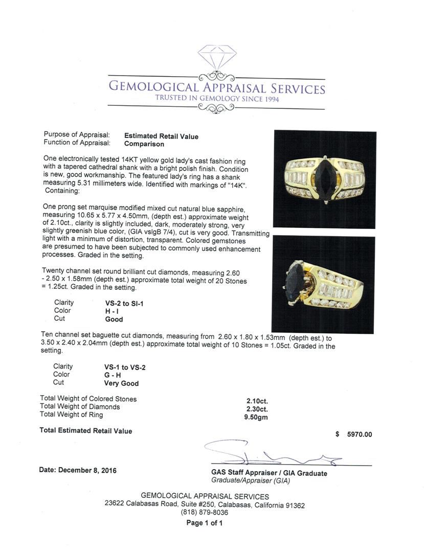 One electronically tested 14KT yellow gold lady's cast fashion ring with a tapered cathedral shank with a bright polish finish. The featured lady's ring has a shank measuring 5.31 millimeters wide. Identified with markings of '14K'. Condition is new, good workmanship. Containing: One prong set marquise modified mixed cut natural blue sapphire, measuring 10.65 x 5.77 x 4.50mm, (depth est.) approximate weight of 2.10ct., clarity is slightly included, dark, moderately strong, very slightly greenish blue color, (GIA vslgB 7/4), cut is very good. Transmitting light with a minimum of distortion, transparent. Colored gemstones are presumed to have been subjected to commonly used enhancement processes. Graded in the setting. Twenty channel set round brilliant cut diamonds, measuring 2.60 - 2.50 x 1.58mm (depth est.) approximate total weight of 20 Stones = 1.25ct. Graded in the setting. Clarity VS-2 to SI-1. Color: H - I Cut Good Ten channel set baguette cut diamonds, measuring from 2.60 x 1.80 x 1.53mm (depth est.) to 3.50 x 2.40 x 2.04mm (depth est.) approximate total weight of 10 Stones = 1.05ct. Graded in the setting. Clarity VS-1 to VS-2. Color: G - H Cut Very Good. Total Weight of Colored Stones 2.10ct.. Total Weight of Diamonds 2.30ct.. Total Weight of Ring 9.50gm. GAS Appraised at $5,970.00.