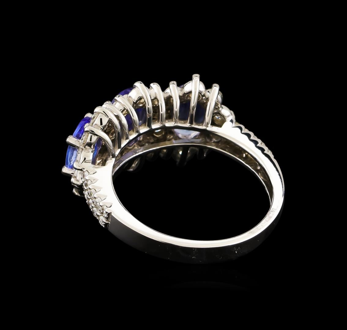 One electronically tested 14KT white gold lady's cast 3-stone halo ring with a bright polish finish. The featured lady's ring has a shank measuring 2.60 millimeters wide. Identified with markings of "K14". Condition is new, good workmanship. Containing: Three prong set oval modified brilliant cut natural tanzanites, measuring 7.02 x 5.00 x 2.78mm, approximate total weight of 2.10ct., clarity is eye clean, medium light, very slightly grayish, bluish violet color, (GIA bV 4/3), cut is very good. Transmitting light with no distortion, transparent. Colored gemstones are presumed to have been subjected to commonly used enhancement processes. Graded in the setting. Twenty-Six prong set round brilliant cut diamonds, measuring 2.10 - 2.00 x 1.27mm (depth est.) approximate total weight of 26 Stones = 0.85ct. Graded in the setting. Clarity: SI-1 to SI-2. Color: H - I. Cut Very Good Twenty prong set round brilliant cut diamonds, measuring 1.35 - 1.25 x 0.78mm (depth est.) approximate total weight of 20 Stones = 0.16ct. Graded in the setting. Clarity: SI-1 to I-1. Color: H - I. Cut Good. Total Weight of Colored Stones 2.10ct. Total Weight of Diamonds 1.01ct. Total Weight of Ring 5.00gm. GAS Appraised at $4,340.00.