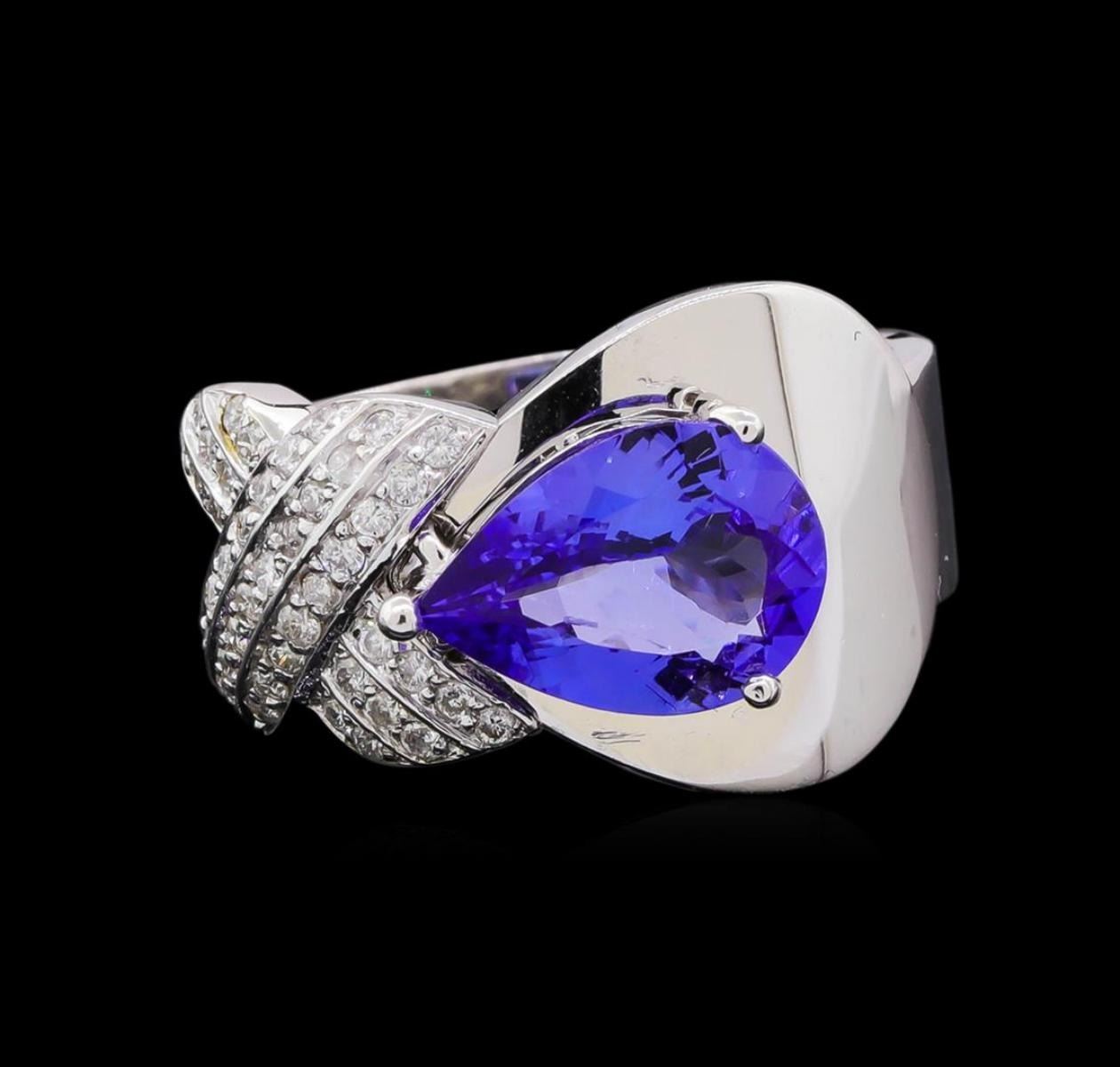 One electronically tested 14KT white gold lady's cast fashion ring with a bright polish finish. The featured lady's ring has a shank measuring 4.62 millimeters in width. Identified with markings of "K14". Condition is new, good workmanship. Containing: Forty-Five prong set round brilliant cut diamonds, measuring 1.20 - 1.15 x 0.72mm (depth est.) approximate total weight of 45 Stones = 0.28ct. Graded in the setting. Clarity: SI-1 to I-1. Color: H - I. Cut Good One prong set pear brilliant cut natural tanzanite, measuring 11.20 x 7.74 x 4.11mm, (depth est.) approximate weight of 2.10ct., clarity is eye clean, medium, moderately strong, bluish violet color, (GIA bV 5/4), cut is very good. Transmitting light with no distortion, transparent. Colored gemstones are presumed to have been subjected to commonly used enhancement processes. Graded in the setting. Total Weight of Colored Stones 2.10ct. Total Weight of Diamonds 0.28ct. Total Weight of Ring 6.80gm. GAS Appraised.