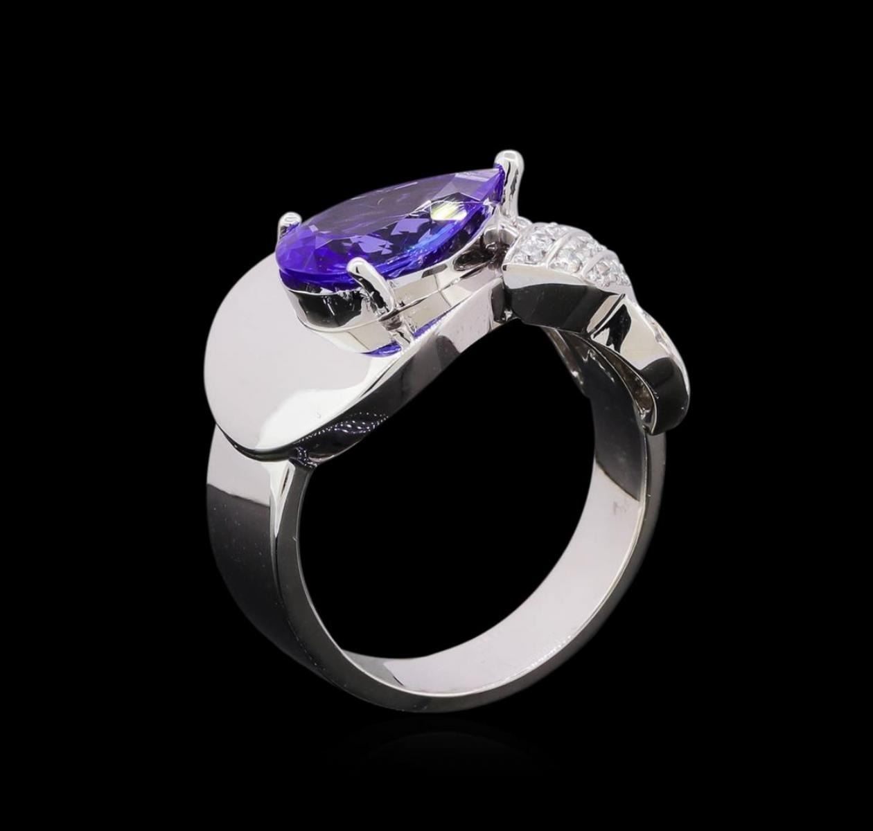 One electronically tested 14KT white gold lady's cast fashion ring with a bright polish finish. The featured lady's ring has a shank measuring 4.62 millimeters in width. Identified with markings of "K14". Condition is new, good workmanship. Containing: Forty-Five prong set round brilliant cut diamonds, measuring 1.20 - 1.15 x 0.72mm (depth est.) approximate total weight of 45 Stones = 0.28ct. Graded in the setting. Clarity: SI-1 to I-1. Color: H - I. Cut Good One prong set pear brilliant cut natural tanzanite, measuring 11.20 x 7.74 x 4.11mm, (depth est.) approximate weight of 2.10 ct., clarity is eye clean, medium, moderately strong, bluish violet color, (GIA bV 5/4), cut is very good. Transmitting light with no distortion, transparent. Colored gemstones are presumed to have been subjected to commonly used enhancement processes. Graded in the setting. Total Weight of Colored Stones 2.10 ct. Total Weight of Diamonds 0.28ct. Total Weight of Ring 6.80gm. GAS Appraised.