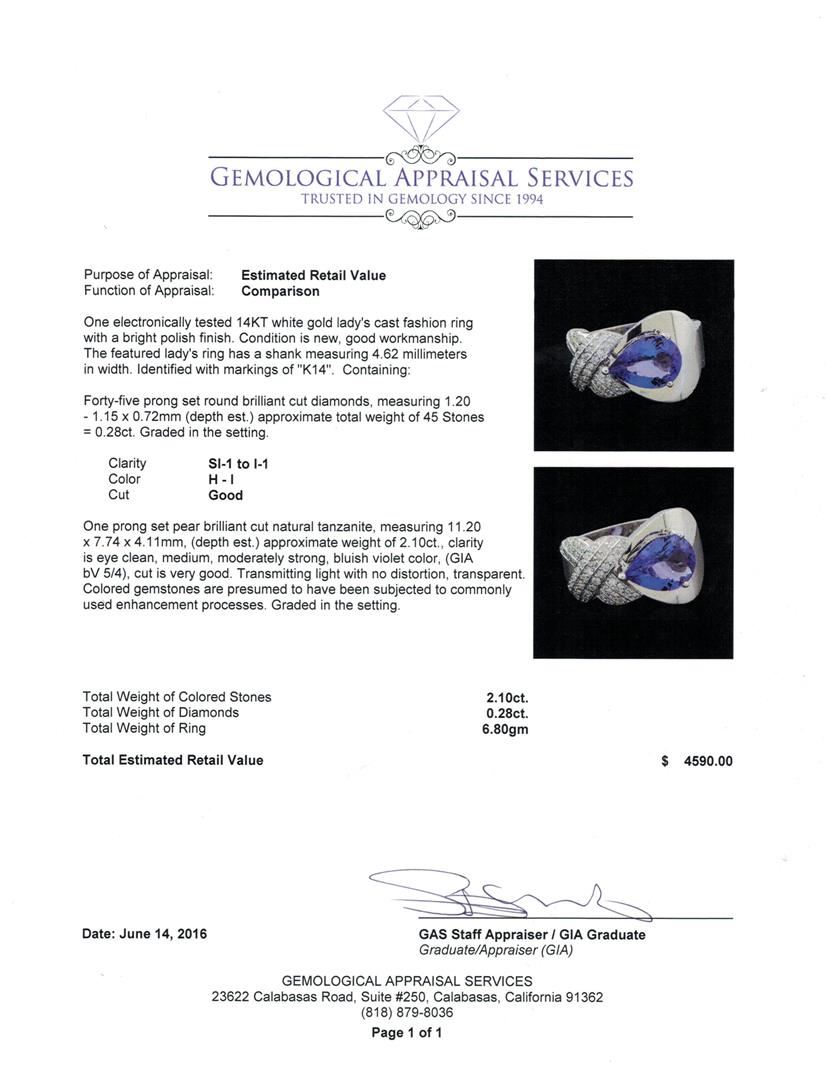 One electronically tested 14KT white gold lady's cast fashion ring with a bright polish finish. The featured lady's ring has a shank measuring 4.62 millimeters in width. Identified with markings of "K14". Condition is new, good workmanship. Containing: Forty-Five prong set round brilliant cut diamonds, measuring 1.20 - 1.15 x 0.72mm (depth est.) approximate total weight of 45 Stones = 0.28ct. Graded in the setting. Clarity: SI-1 to I-1. Color: H - I. Cut Good One prong set pear brilliant cut natural tanzanite, measuring 11.20 x 7.74 x 4.11mm, (depth est.) approximate weight of 2.10 ct., clarity is eye clean, medium, moderately strong, bluish violet color, (GIA bV 5/4), cut is very good. Transmitting light with no distortion, transparent. Colored gemstones are presumed to have been subjected to commonly used enhancement processes. Graded in the setting. Total Weight of Colored Stones 2.10 ct. Total Weight of Diamonds 0.28ct. Total Weight of Ring 6.80gm. GAS Appraised.