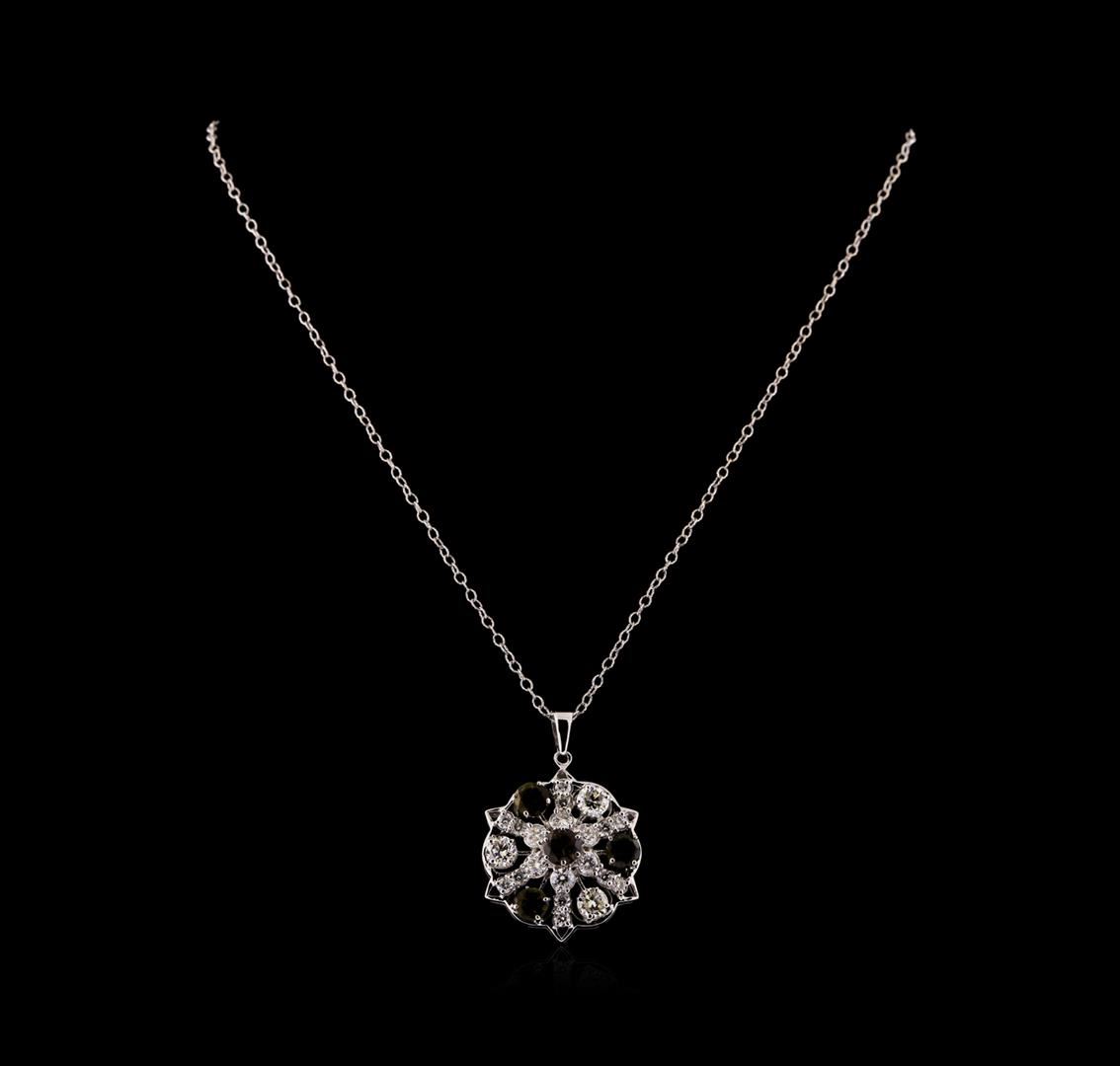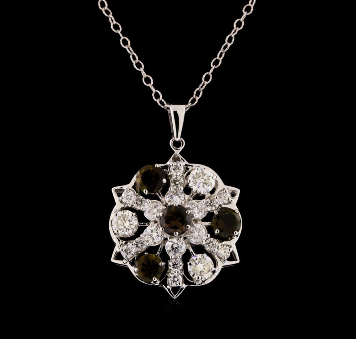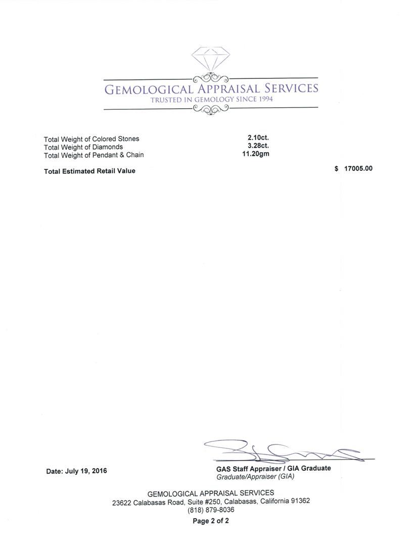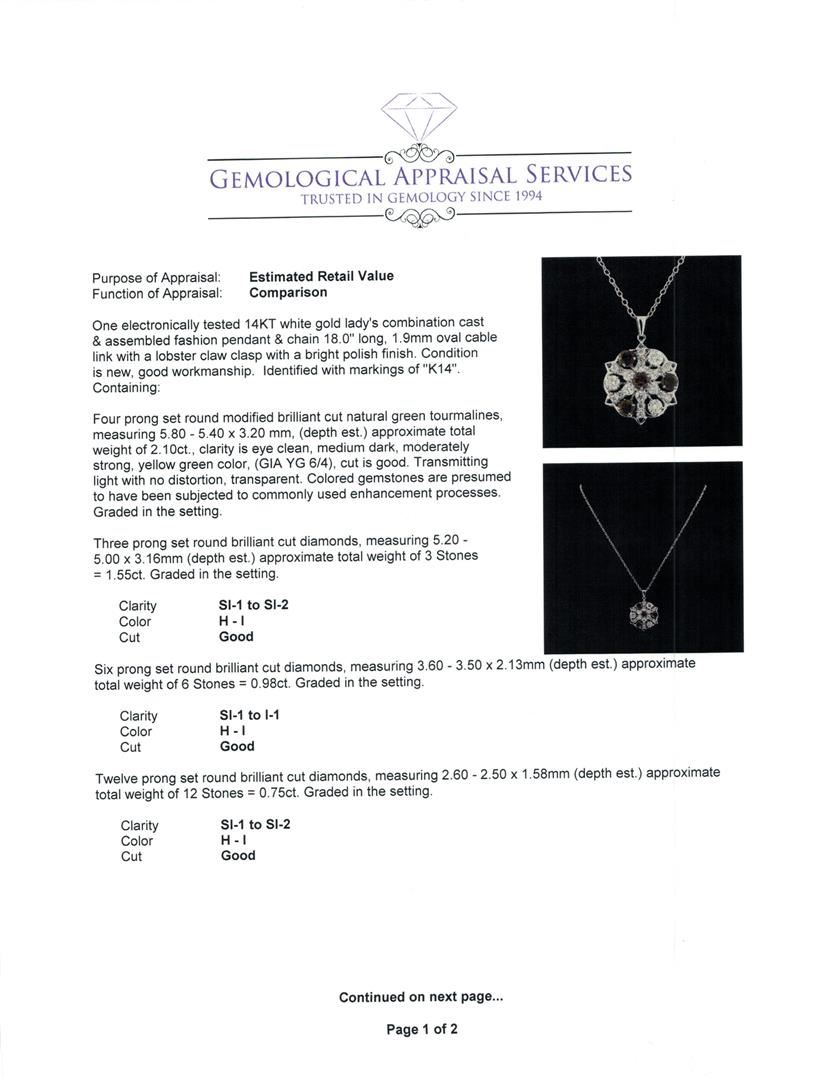 One electronically tested 14KT white gold lady's combination cast & assembled fashion pendant & chain 18.0' long, 1.9mm oval cable link with a lobster claw clasp with a bright polish finish. Identified with markings of 'K14'. Condition is new, good workmanship. Containing: Four prong set round modified brilliant cut natural green tourmalines, measuring 5.80 - 5.40 x 3.20 mm, (depth est.) approximate total weight of 2.10ct., clarity is eye clean, medium dark, moderately strong, yellow green color, (GIA YG 6/4), cut is good. Transmitting light with no distortion, transparent. Colored gemstones are presumed to have been subjected to commonly used enhancement processes. Graded in the setting. Three prong set round brilliant cut diamonds, measuring 5.20 - 5.00 x 3.16mm (depth est.) approximate total weight of 3 Stones = 1.55ct. Graded in the setting. Clarity SI-1 to SI-2. Color: H - I Cut Good Six prong set round brilliant cut diamonds, measuring 3.60 - 3.50 x 2.13mm (depth est.) approximate total weight of 6 Stones = 0.98ct. Graded in the setting. Clarity SI-1 to I-1. Color: H - I Cut Good Twelve prong set round brilliant cut diamonds, measuring 2.60 - 2.50 x 1.58mm (depth est.) approximate total weight of 12 Stones = 0.75ct. Graded in the setting. Clarity SI-1 to SI-2. Color: H - I Cut Good. Total Weight of Colored Stones 2.10ct.. Total Weight of Diamonds 3.28ct.. Total Weight of Pendant & Chain 11.20gm. GAS Appraised at $17,005.00.
