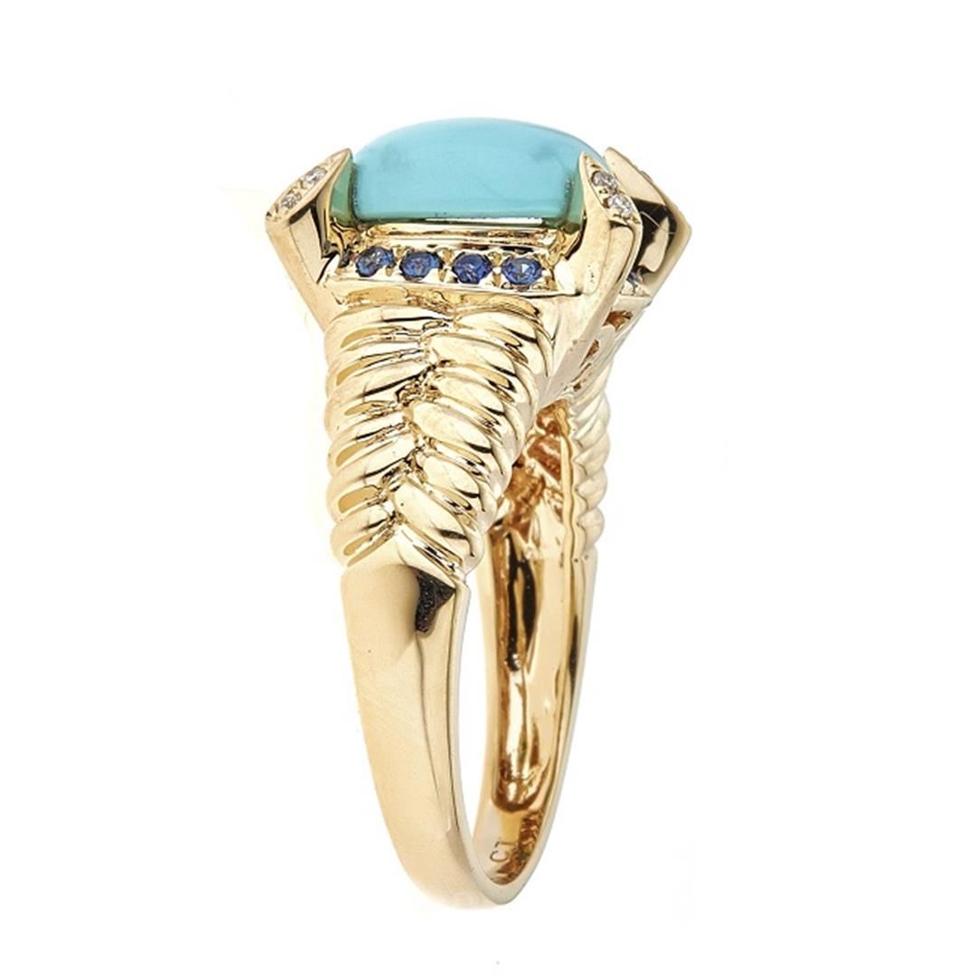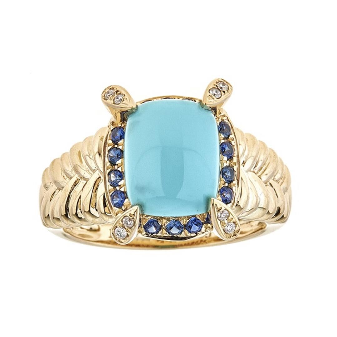 One Turquoise , , and Diamond Ring featuring: 14KT Yellow Gold with a total weight of 5.51 grams, Turquoise with a total weight of 2.10ct, Blue Sapphire with a total weight of 0.23ct, and diamonds with a total weight of 0.04ct.