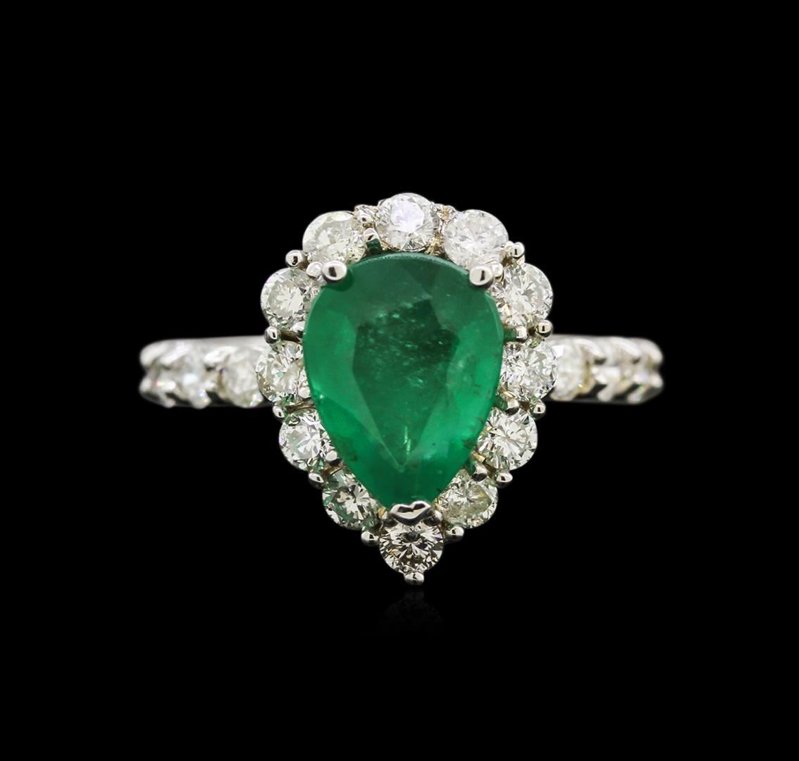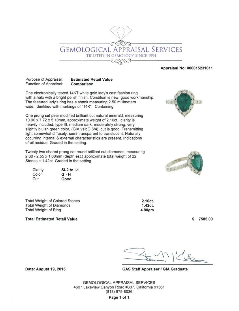 One electronically tested 14KT white gold lady's cast fashion ring with a halo with a bright polish finish. The featured lady's ring has a shank measuring 2.50 millimeters wide. Identified with markings of "14K". Condition is new, good workmanship. Containing: One prong set pear modified brilliant cut natural emerald, measuring 10.00 x 7.72 x 5.10mm, approximate weight of 2.10ct., clarity is heavily included, type III, medium dark, moderately strong, very slightly bluish green color, (GIA vslbG 6/4), cut is good. Transmitting light somewhat diffusely, semi-transparent to translucent. Naturally occurring internal & external characteristics are present. Indications of oil residue. Graded in the setting. Twenty-Two shared prong set round brilliant cut diamonds, measuring 2.60 - 2.55 x 1.60mm (depth est.) approximate total weight of 22 Stones = 1.42ct. Graded in the setting. Clarity: SI-2 to I-1. Color: G - Good. Total Weight of Colored Stones 2.10ct. Total Weight of Diamonds 1.42ct. Total Weight of Ring 4.80gm. GAS Appraised at $7,585.00.