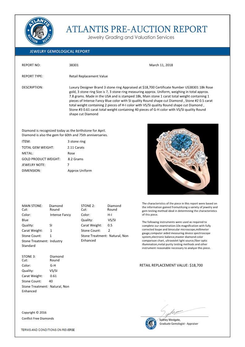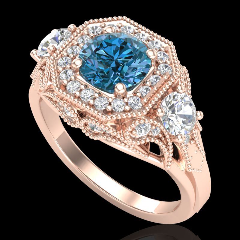 REF-283Y6K -38301 ---- 2.11 CTW Intense Blue Diamond Solitaire Art Deco 3 Stone Ring 18K Rose Gold ---- Luxury Designer Brand 3 stone ring Appraised at $18,700 Certificate Number US38301 18k Rose gold, 3 stone ring Size is 7, 3 stone ring measuring approx. Uniform, weighing in total approx. 7.8 grams. Made in the USA and is stamped 18k, Main stone 1 carat total weight containing 1 pieces of Intense Fancy Blue color with SI quality Round shape cut Diamond , Stone #2 0.5 carat total weight containing 2 pieces of H-I color with VS/SI quality Round shape cut Diamond , Stone #3 0.61 carat total weight containing 40 pieces of G-H color with VS/SI quality Round shape cut Diamond