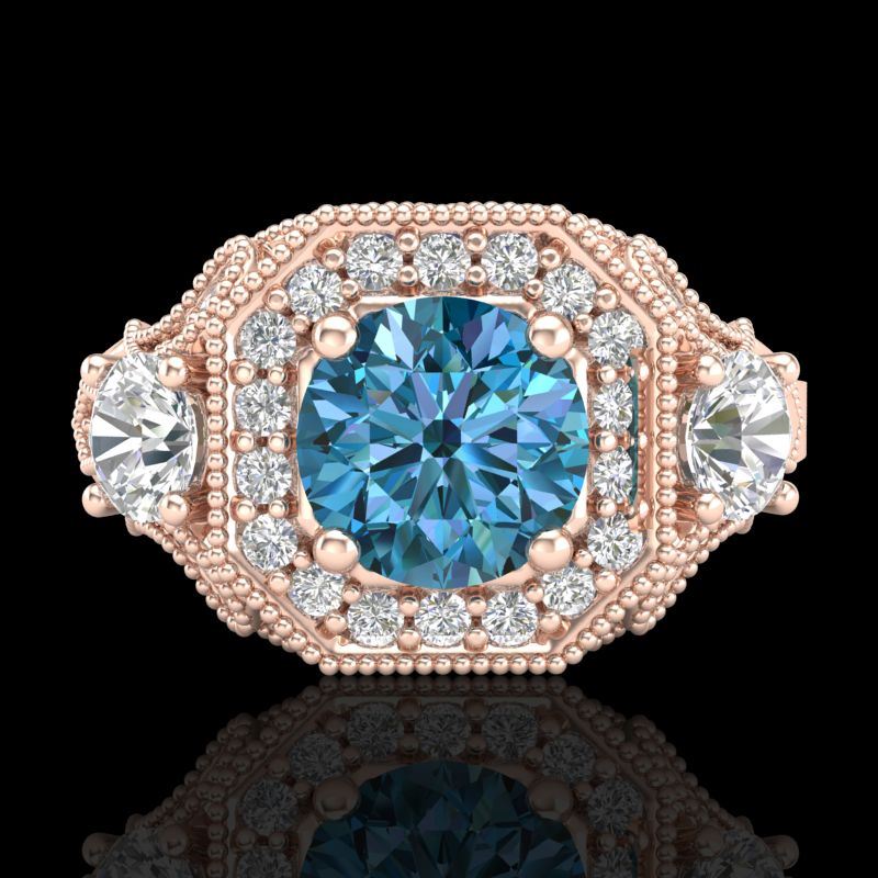 REF-283Y6K -38301 ---- 2.11 CTW Intense Blue Diamond Solitaire Art Deco 3 Stone Ring 18K Rose Gold ---- Luxury Designer Brand 3 stone ring Appraised at $18,700 Certificate Number US38301  18k Rose gold,  3 stone ring Size is 7, 3 stone ring measuring approx. Uniform, weighing in total approx. 7.8 grams. Made in the USA and is stamped 18k, Main stone 1 carat total weight containing 1 pieces of Intense Fancy Blue color with SI quality Round shape cut Diamond , Stone #2 0.5 carat total weight containing 2 pieces of H-I color with  VS/SI quality Round shape cut Diamond , Stone #3 0.61 carat total weight containing 40 pieces of G-H color with VS/SI quality  Round shape cut Diamond