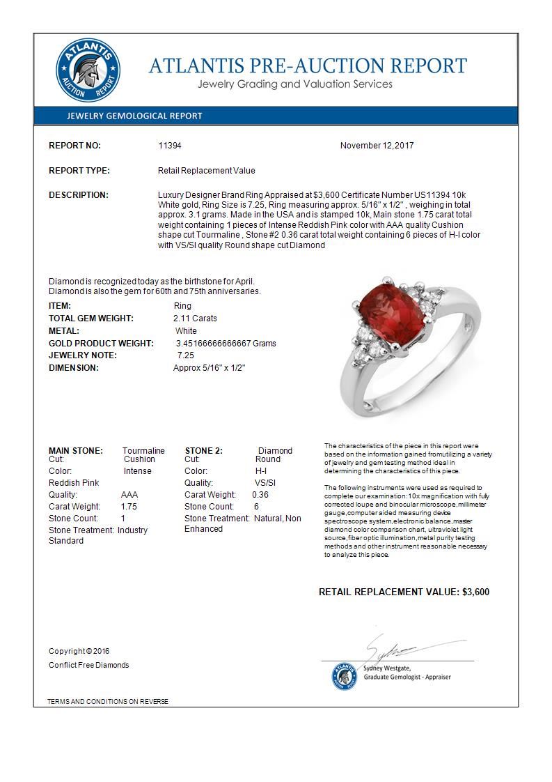 REF-46X5T -11394 ---- 2.11 CTW Pink Tourmaline & Diamond Ring 10K White Gold ---- Luxury Designer Brand Ring Appraised at $3,600 Certificate Number US11394 10k White gold, Ring Size is 7.25, Ring measuring approx. 5/16" x 1/2" , weighing in total approx. 3.1 grams. Made in the USA and is stamped 10k, Main stone 1.75 carat total weight containing 1 pieces of Intense Reddish Pink color with AAA quality Cushion shape cut Tourmaline , Stone #2 0.36 carat total weight containing 6 pieces of H-I color with VS/SI quality Round shape cut Diamond