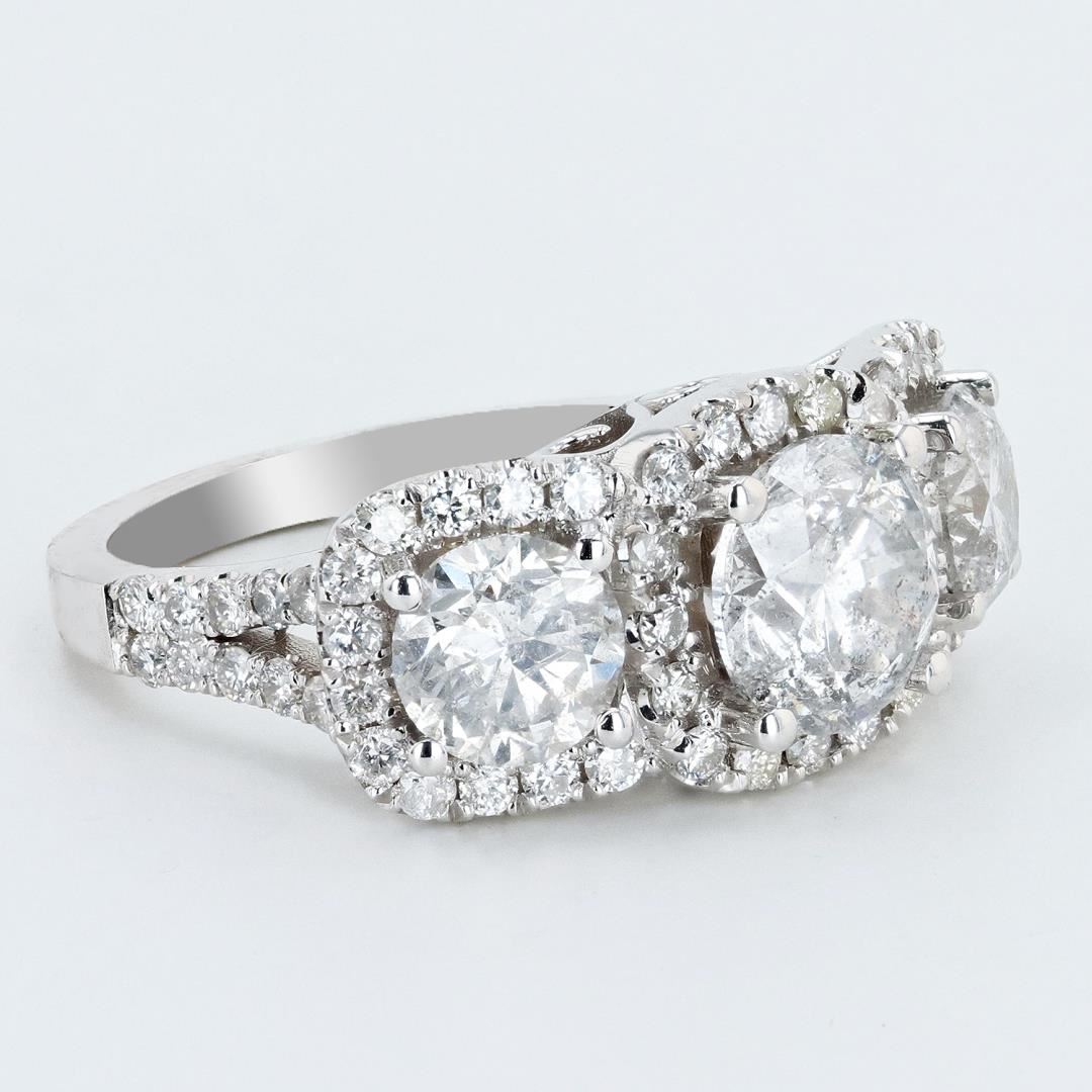 Eighteen karat (18K) white gold round brilliant cut diamond ring. A round brilliant cut diamond is mounted in the center of the ring. Round brilliant cut diamonds accent the ring around and on both sides of the center diamond. The ring has a gross weight of 9.1 Grams. #NATURAL DIAMOND# 1) CENTER DIAMOND SHAPE: Round Brilliant Cut QUANTITY: 1, Mounted Total WEIGHT: 2.11 carat total DIMENSIONS: 7.98 x 7.95mm GIRDLE: Thin-Thick, Faceted CULET: None CLARITY: I1 COLOR: H CUT: Excellent SYMMETRY: Excellent POLISH: Excellent FLUORESCENCE: None 2) DIAMOND SETTING SHAPE: Round Brilliant Cut WEIGHT: 3.03 carat total (60pcs. 6.3 x 1.6mm) AVERAGE CLARITY: SI1-I1 AVERAGE COLOR: G-H SYMMETRY: Excellent POLISH: Excellent #METAL# METAL: Gold PURITY: 18K (750) COLOR: White CONDITION: Excellent FINISH: High Polish