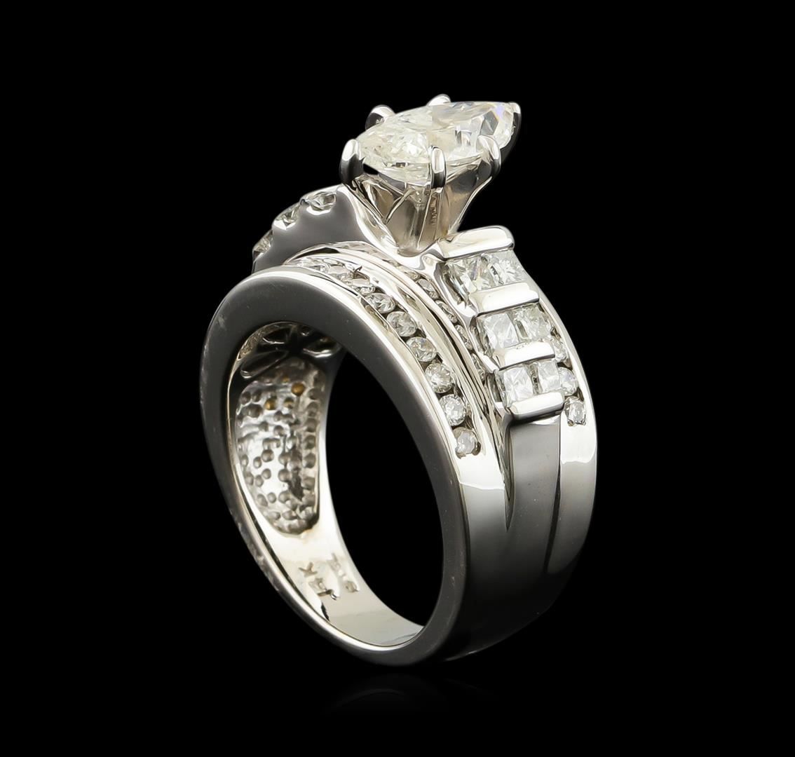 One electronically tested 14KT white gold lady's cast wedding ring with a bright polish finish. The featured lady's ring has a shank measuring 4.05 millimeters wide. Identified with markings of "14K". Condition is new, good workmanship. Containing: One prong set marquise shaped cut diamond, measuring 9.05 x 4.94 x 3.95mm (depth est.) approximate weight of 1.03ct. Graded in the setting. Clarity: I-1. Color: H - I. Cut Good Twelve channel set princess cut diamonds, measuring 2.30 x 2.00 x 1.50mm (depth est.) approximate total weight of 12 Stones = 0.70ct. Graded in the setting. Clarity: SI-2 to I-1. Color: G - Good Twenty-Six channel set round brilliant cut diamonds, measuring 1.60 - 1.50 x 0.96mm (depth est.) approximate total weight of 26 Stones = 0.38ct. Graded in the setting. Clarity: SI-1 to I-1. Color: G - Good. Total Weight of Diamonds 2.11ct. Total Weight of Ring 9.20gm GAS Appraised at $11,555.00.