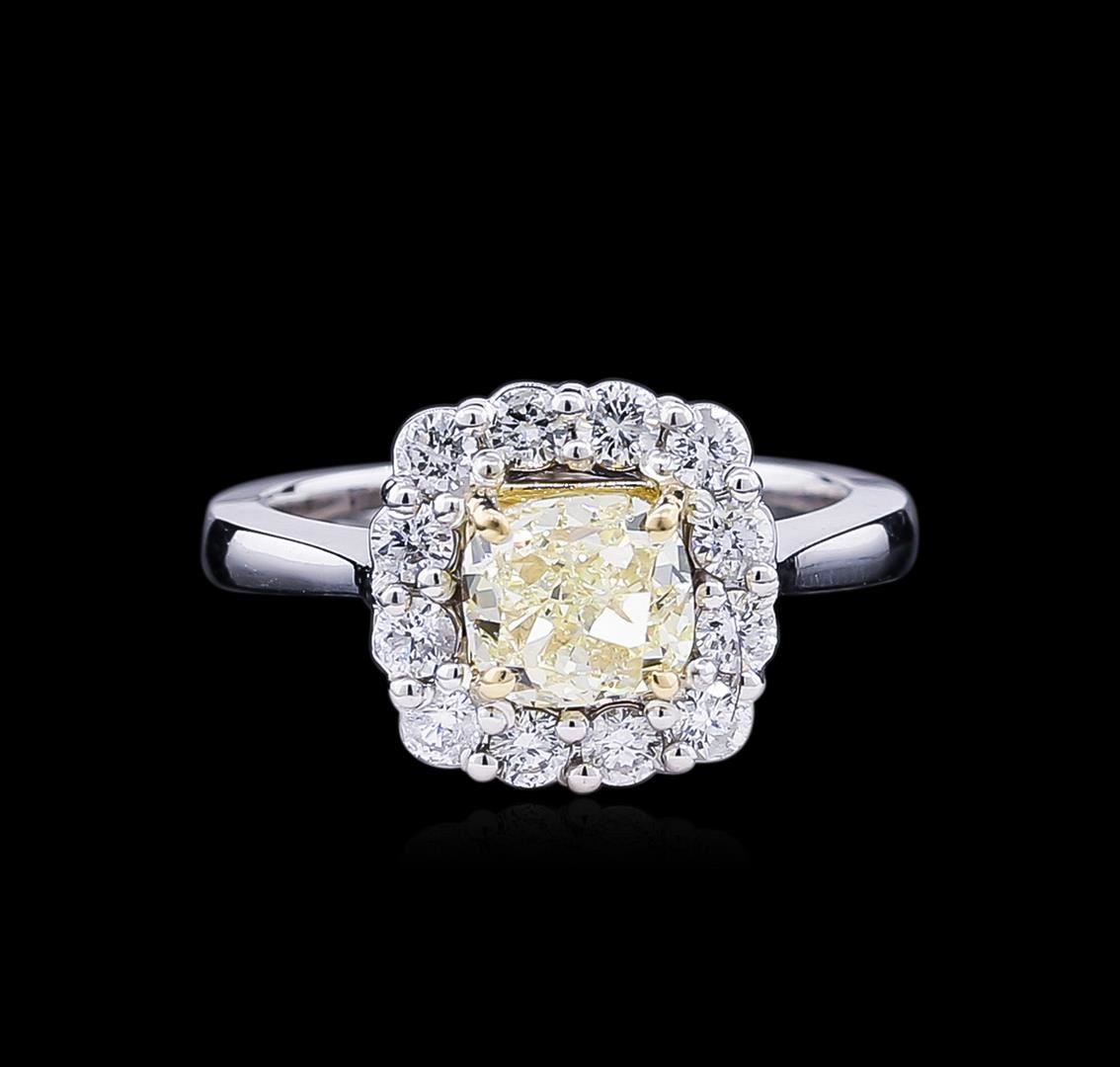 One electronically tested 14KT white and yellow gold lady's combination cast & assembled wedding ring with a basket halo with a bright polish finish. The featured lady's ring has a shank measuring 2.76 millimeters wide. Identified with markings of "14K". Condition is new, good workmanship. Containing: One prong set cushion cut diamond, measuring 6.53 x 5.99 x 4.26mm (depth est.) , 5.00.%. GTCF approximate weight of 1.51ct. Graded in the setting. Clarity: SI-1 Cut Good Twelve prong set round brilliant cut diamonds, measuring 2.40 - 2.30 x 1.48mm (depth est.) approximate total weight of 12 Stones = 0.60ct. Graded in the setting. Clarity: SI-1 to SI-2. Color: G - I. Cut Very Good. Total Weight of Diamonds 2.11ct. Total Weight of Ring 5.80gm. GAS Appraised at $20,125.00.