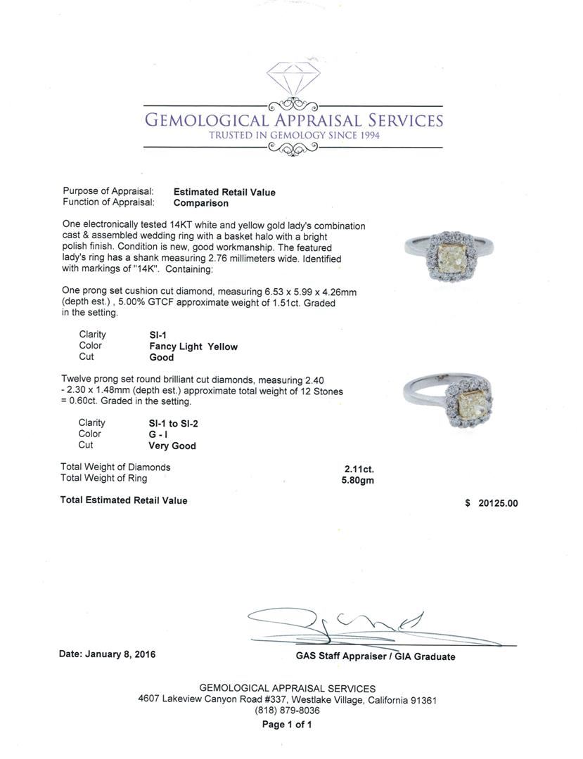 One electronically tested 14KT white and yellow gold lady's combination cast & assembled wedding ring with a basket halo with a bright polish finish. The featured lady's ring has a shank measuring 2.76 millimeters wide. Identified with markings of "14K". Condition is new, good workmanship. Containing: One prong set cushion cut diamond, measuring 6.53 x 5.99 x 4.26mm (depth est.) , 5.00.%. GTCF approximate weight of 1.51ct. Graded in the setting. Clarity: SI-1 Cut Good Twelve prong set round brilliant cut diamonds, measuring 2.40 - 2.30 x 1.48mm (depth est.) approximate total weight of 12 Stones = 0.60ct. Graded in the setting. Clarity: SI-1 to SI-2. Color: G - I. Cut Very Good. Total Weight of Diamonds 2.11ct. Total Weight of Ring 5.80gm. GAS Appraised at $20,125.00.