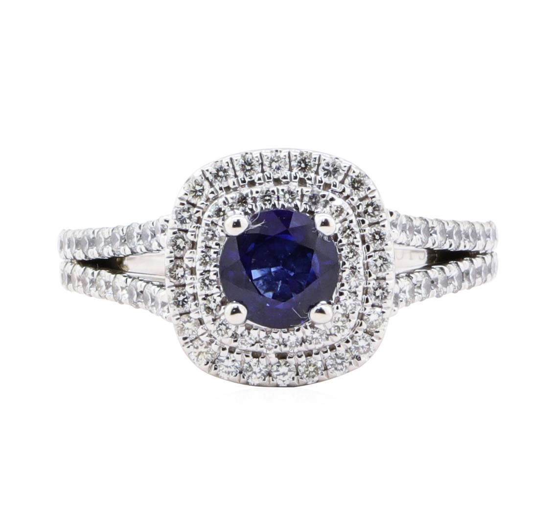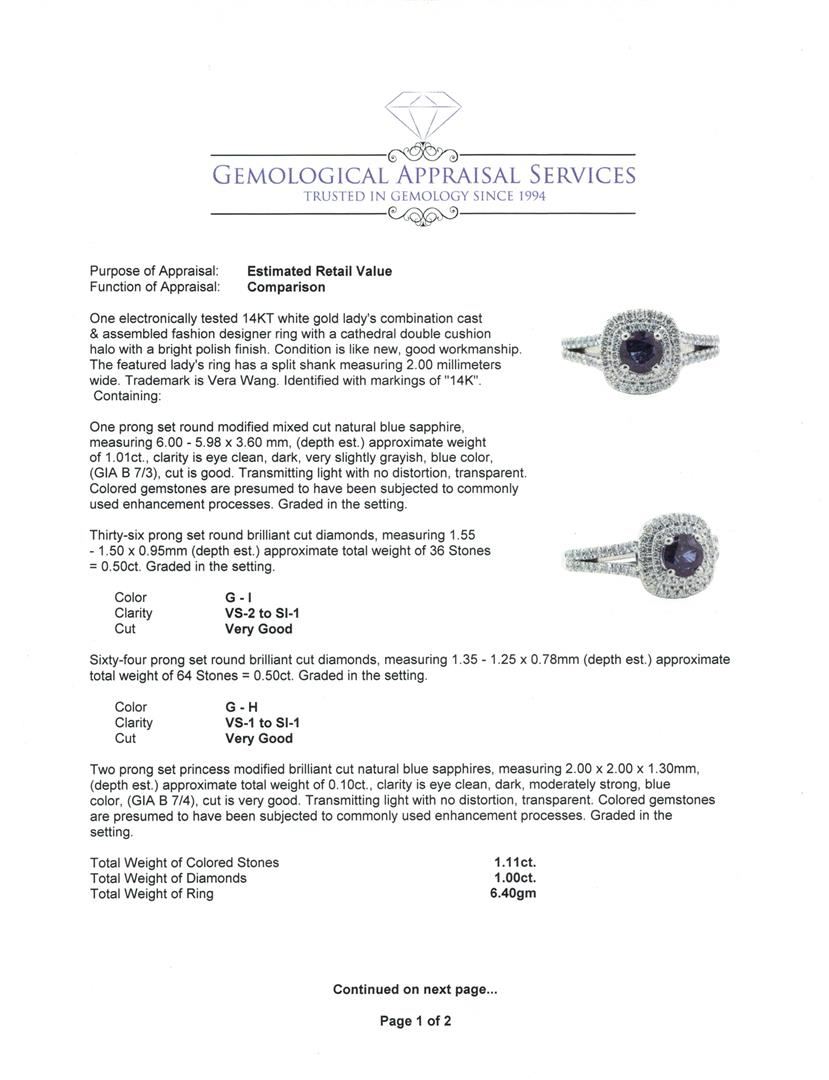 One electronically tested 14KT white gold lady's combination cast & assembled fashion designer ring with a cathedral double cushion halo with a bright polish finish. The featured lady's ring has a split shank measuring 2.00 millimeters wide. Trademark is Vera Wang. Identified with markings of '14K'. Condition is Good. Containing: One prong set round modified mixed cut natural blue sapphire, measuring 6.00 - 5.98 x 3.60 mm, (depth est.) approximate weight of 1.01ct., clarity is eye clean, dark, very slightly grayish, blue color, (GIA B 7/3), cut is good. Transmitting light with no distortion, transparent. Colored gemstones are presumed to have been subjected to commonly used enhancement processes. Graded in the setting. Thirty-Six prong set round brilliant cut diamonds, measuring 1.55 - 1.50 x 0.95mm (depth est.) approximate total weight of 36 Stones = 0.50 ct. Graded in the setting. Color G - I Clarity VS-2 to SI-1 Cut Very Good Sixty-Four prong set round brilliant cut diamonds, measuring 1.35 - 1.25 x 0.78mm (depth est.) approximate total weight of 64 Stones = 0.50 ct. Graded in the setting. Color G - H Clarity VS-1 to SI-1 Cut Very Good Two prong set princess modified brilliant cut natural blue sapphires, measuring 2.00 x 2.00 x 1.30mm, (depth est.) approximate total weight of 0.10 ct., clarity is eye clean, dark, moderately strong, blue color, (GIA B 7/4), cut is very good. Transmitting light with no distortion, transparent. Colored gemstones are presumed to have been subjected to commonly used enhancement processes. Graded in the setting. Total Weight of Colored Stones 1.11ct.. Total Weight of Diamonds 1.00 ct.. Total Weight of Ring 6.40gm GAS Appraised at $5180.00. GAS Appraised.