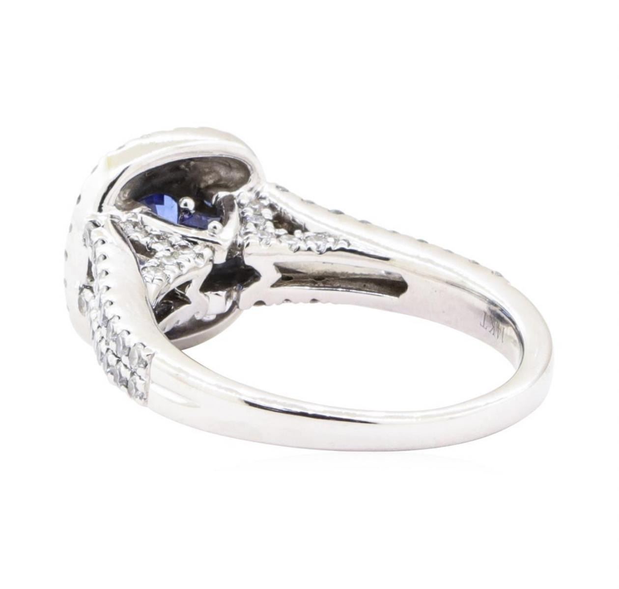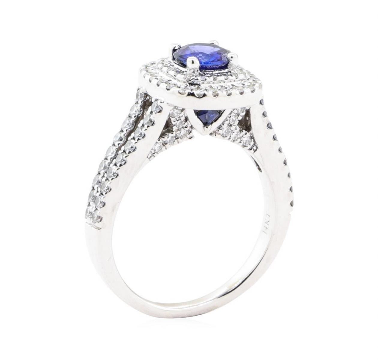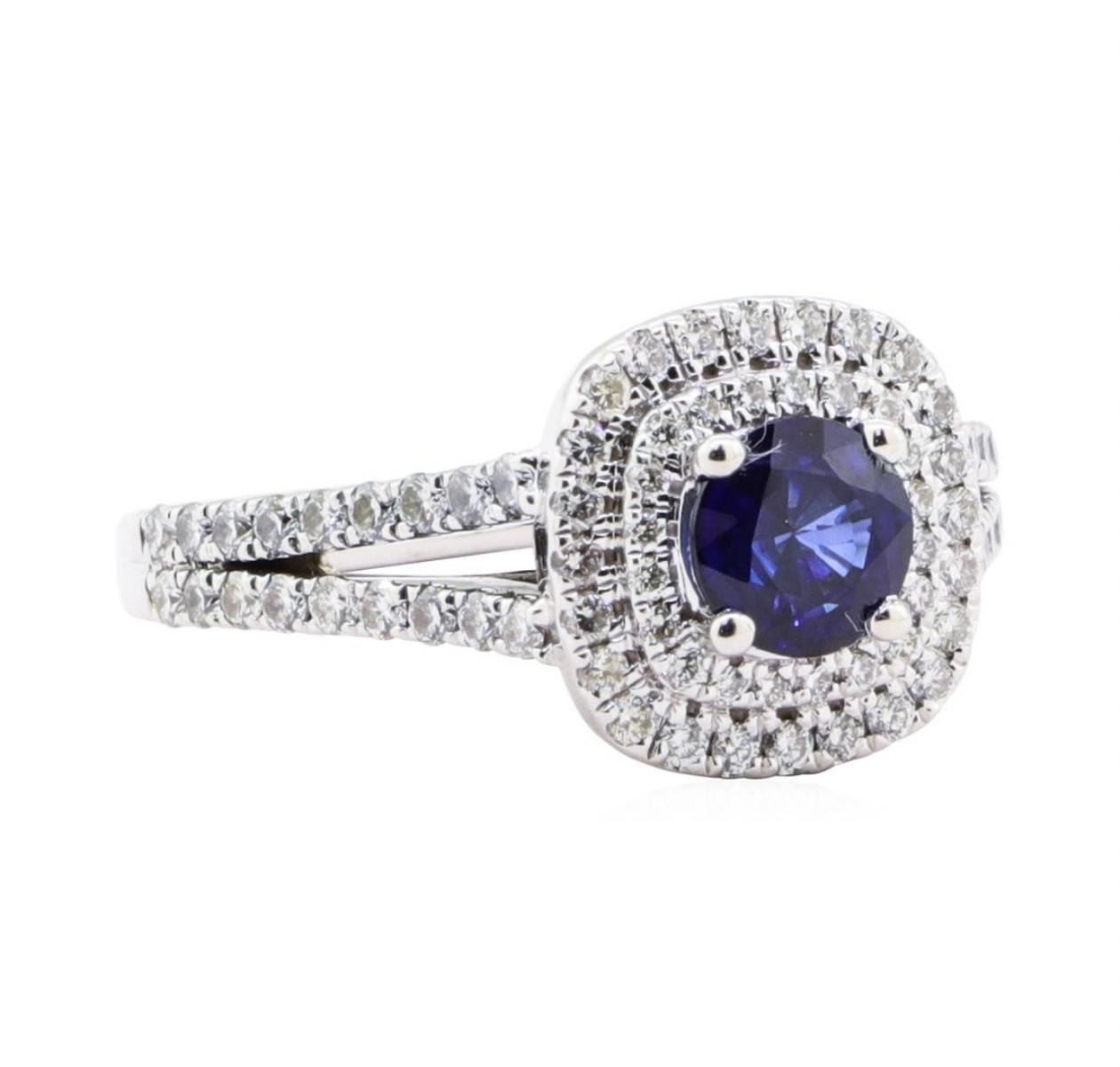 One electronically tested 14KT white gold lady's combination cast & assembled fashion designer ring with a cathedral double cushion halo with a bright polish finish. The featured lady's ring has a split shank measuring 2.00 millimeters wide. Trademark is Vera Wang. Identified with markings of '14K'. Condition is Good. Containing: One prong set round modified mixed cut natural blue sapphire, measuring 6.00 - 5.98 x 3.60 mm, (depth est.) approximate weight of 1.01ct., clarity is eye clean, dark, very slightly grayish, blue color, (GIA B 7/3), cut is good. Transmitting light with no distortion, transparent. Colored gemstones are presumed to have been subjected to commonly used enhancement processes. Graded in the setting. Thirty-Six prong set round brilliant cut diamonds, measuring 1.55 - 1.50 x 0.95mm (depth est.) approximate total weight of 36 Stones = 0.50 ct. Graded in the setting. Color G - I Clarity VS-2 to SI-1 Cut Very Good Sixty-Four prong set round brilliant cut diamonds, measuring 1.35 - 1.25 x 0.78mm (depth est.) approximate total weight of 64 Stones = 0.50 ct. Graded in the setting. Color G - H Clarity VS-1 to SI-1 Cut Very Good Two prong set princess modified brilliant cut natural blue sapphires, measuring 2.00 x 2.00 x 1.30mm, (depth est.) approximate total weight of 0.10 ct., clarity is eye clean, dark, moderately strong, blue color, (GIA B 7/4), cut is very good. Transmitting light with no distortion, transparent. Colored gemstones are presumed to have been subjected to commonly used enhancement processes. Graded in the setting. Total Weight of Colored Stones 1.11ct.. Total Weight of Diamonds 1.00 ct.. Total Weight of Ring 6.40gm GAS Appraised at $5180.00. GAS Appraised.
