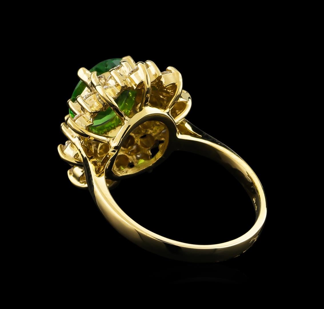 One electronically tested 14KT yellow gold ladies cast tsavorite garnet and diamond ring with a bright polish finish. The featured tsavorite garnet is set within a tiered diamond floret, completed by a two millimeter wide band. Identified with markings of "K14". Condition is new, good workmanship. Containing: One prong set oval mixed cut natural tsavorite garnet, measuring 9.45 x 7.45 x 3.48mm, exact weight 2.11ct., clarity is slightly included, type II, medium, moderately strong, slightly yellowish green color, (GIA slyG 5/4), cut is good. Transmitting light with a minimum of distortion, transparent. Naturally occurring internal & external characteristics are present. Graded in the setting. Thirty prong set round brilliant cut diamonds, measuring 2.10 - 2.00 x 1.23mm exact total weight 30 Stones = 0.98ct. Graded in the setting. Clarity: SI-2 to I-1. Color: F - H. Total Weight of Colored Stones 2.11ct. Total Weight of Diamonds 0.98ct. Total Weight of Ring 5.31gm. AIG Appraised at $10,800.00.