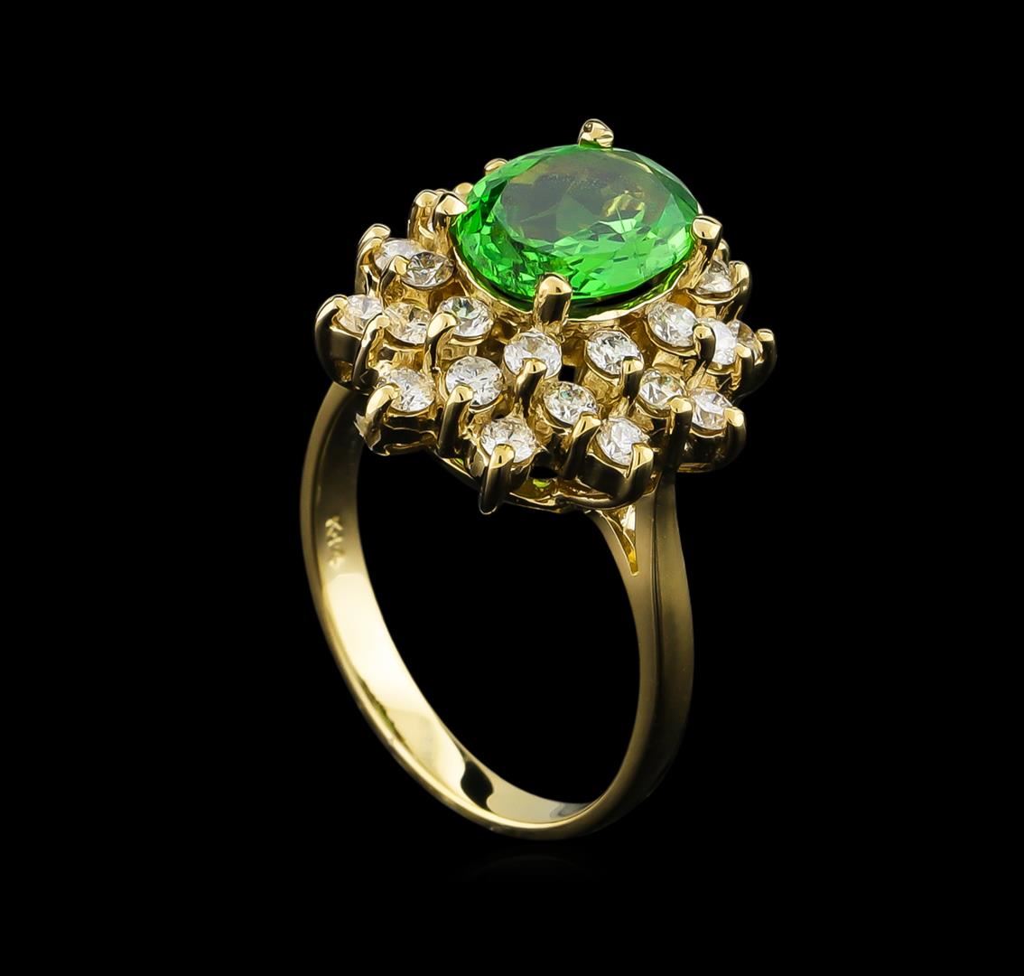 One electronically tested 14KT yellow gold ladies cast tsavorite garnet and diamond ring with a bright polish finish. The featured tsavorite garnet is set within a tiered diamond floret, completed by a two millimeter wide band. Identified with markings of "K14". Condition is new, good workmanship. Containing: One prong set oval mixed cut natural tsavorite garnet, measuring 9.45 x 7.45 x 3.48mm, exact weight 2.11ct., clarity is slightly included, type II, medium, moderately strong, slightly yellowish green color, (GIA slyG 5/4), cut is good. Transmitting light with a minimum of distortion, transparent. Naturally occurring internal & external characteristics are present. Graded in the setting. Thirty prong set round brilliant cut diamonds, measuring 2.10 - 2.00 x 1.23mm exact total weight 30 Stones = 0.98ct. Graded in the setting. Clarity: SI-2 to I-1. Color: F - H. Total Weight of Colored Stones 2.11ct. Total Weight of Diamonds 0.98ct. Total Weight of Ring 5.31gm. AIG Appraised at $10,800.00.