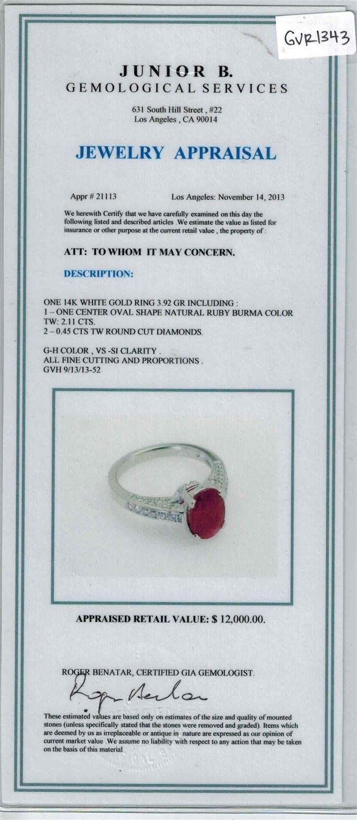 14K W/G NATURAL RUBY RING :3.952GRAM /NATURAL RUBY OVAL :2.11CT/NO LEAD /DIA :0.45CT/#GVR1343/ NO LEAD OR GLASS FILLING
