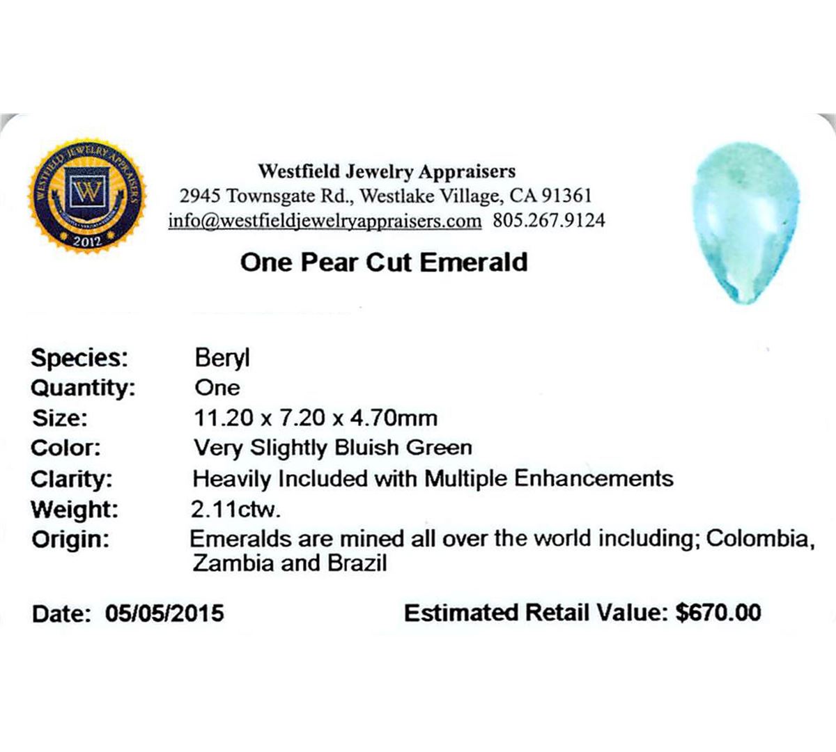 One pear cut natural emerald, measuring 11.20 x 7.20 x 4.70mm, exact weight 2.11ct., clarity is moderately included, type III, medium light, very slightly bluish green color, (GIA vslbG 4/0) Westfield Appraised at $670.00.