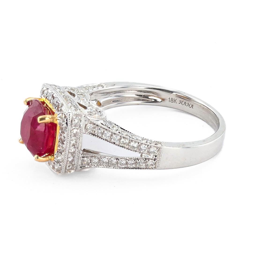 Eighteen karat (18K) two tone gold natural burmese ruby corundum and diamond ring. A cushion brilliant cut natural burmese ruby corundum gemstone is mounted in the center of the ring. Round brilliant cut diamonds accent the ring on both sides of the center gemstone. The ring has a gross weight of 5.5 Grams. Reference: GIA Ruby Report Number 1226723998 Brand: Hana #NATURAL GEMSTONE# GEMSTONE: Burma Ruby Corundum NATURE: Natural SHAPE: Cushion Brilliant, Faceted Cut WEIGHT: 2.12 carat total DIMENSIONS: 7.34 x 6.64 x 4.93mm CLARITY: Type 3 COLOR: Red (5/5) SYMMETRY: Excellent COLOR INTENSITY: Intense TRANSPARENCY: Transparent TONE: Dark #NATURAL DIAMOND# SHAPE: Round Brilliant Cut WEIGHT: 0.84 carat total (118pcs.) DIMENSIONS: 1.3 x 1.1mm AVERAGE CLARITY: VS2-SI1 AVERAGE COLOR: F-G SYMMETRY: Excellent POLISH: Excellent #METAL# METAL: Gold PURITY: 18K (750) COLOR: Two Tone (White & Yellow) CONDITION: Excellent FINISH: High Polish Size: 6 1/2