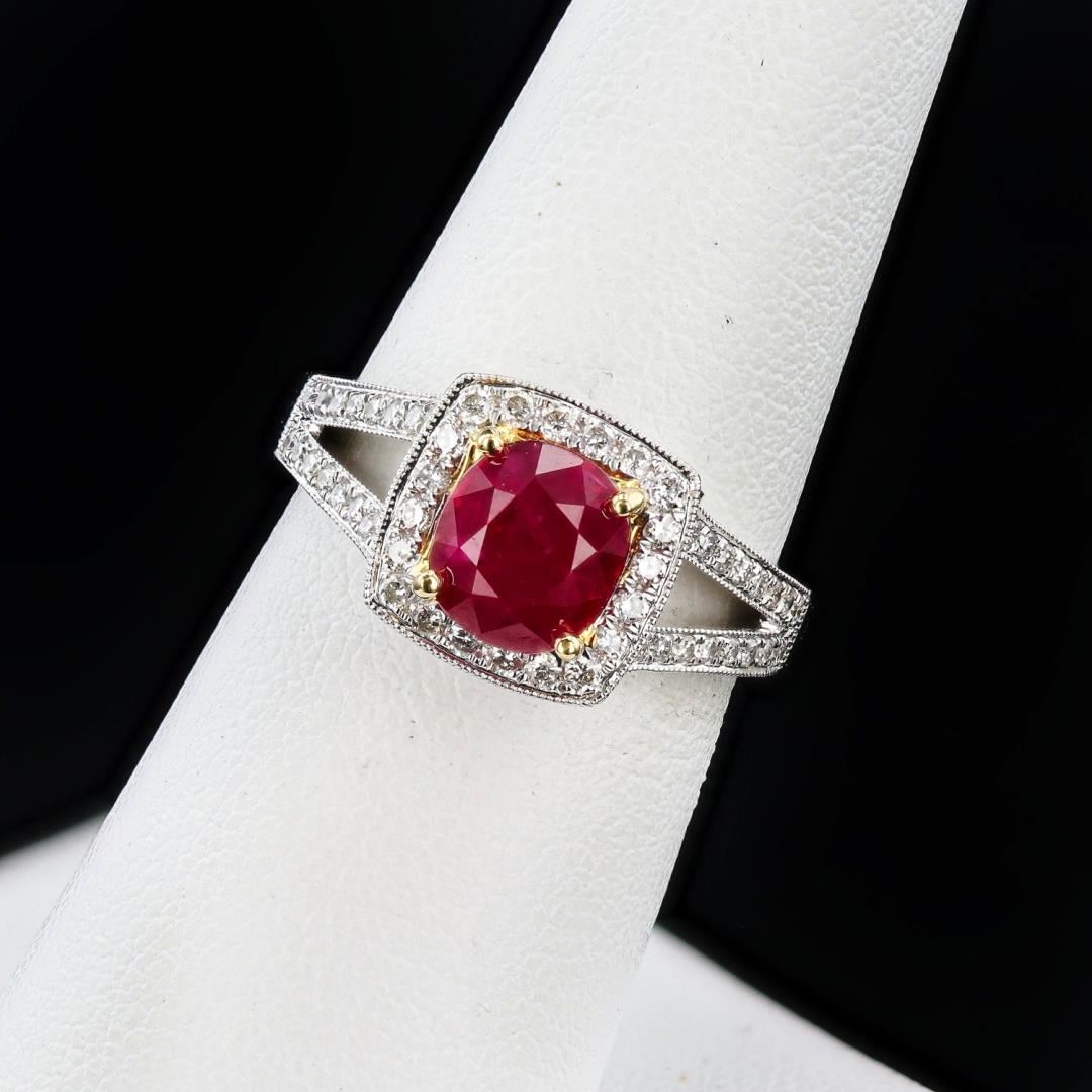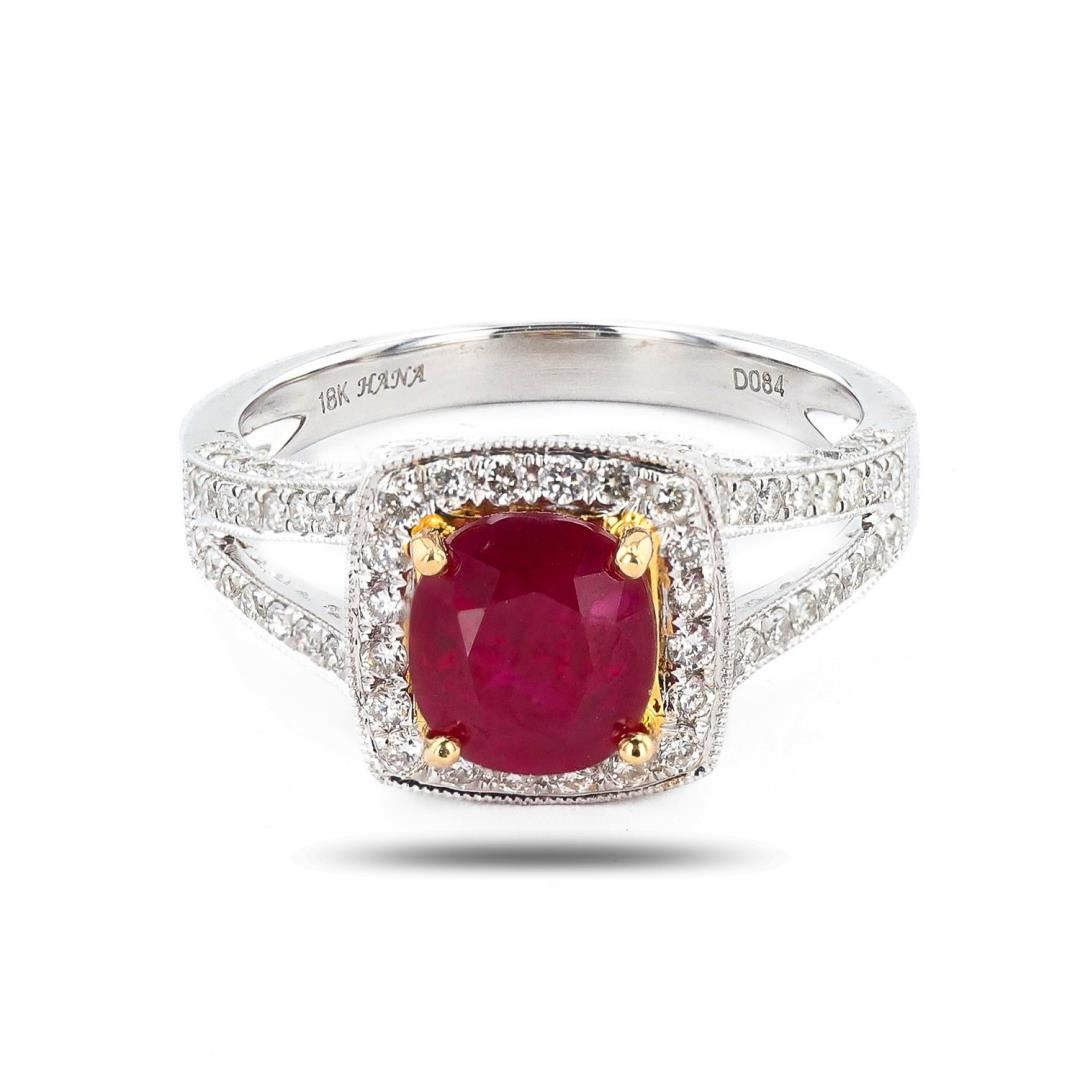 Eighteen karat (18K) two tone gold natural burmese ruby corundum and diamond ring. A cushion brilliant cut natural burmese ruby corundum gemstone is mounted in the center of the ring. Round brilliant cut diamonds accent the ring on both sides of the center gemstone. The ring has a gross weight of 5.5 Grams. Reference: GIA Ruby Report Number 1226723998 Brand: Hana #NATURAL GEMSTONE# GEMSTONE: Burma Ruby Corundum NATURE: Natural SHAPE: Cushion Brilliant, Faceted Cut WEIGHT: 2.12 carat total DIMENSIONS: 7.34 x 6.64 x 4.93mm CLARITY: Type 3 COLOR: Red (5/5) SYMMETRY: Excellent COLOR INTENSITY: Intense TRANSPARENCY: Transparent TONE: Dark #NATURAL DIAMOND# SHAPE: Round Brilliant Cut WEIGHT: 0.84 carat total (118pcs.) DIMENSIONS: 1.3 x 1.1mm AVERAGE CLARITY: VS2-SI1 AVERAGE COLOR: F-G SYMMETRY: Excellent POLISH: Excellent #METAL# METAL: Gold PURITY: 18K (750) COLOR: Two Tone (White & Yellow) CONDITION: Excellent FINISH: High Polish Size: 6 1/2