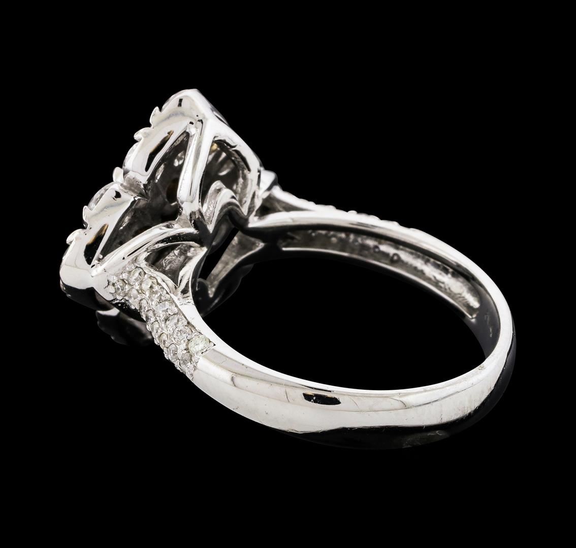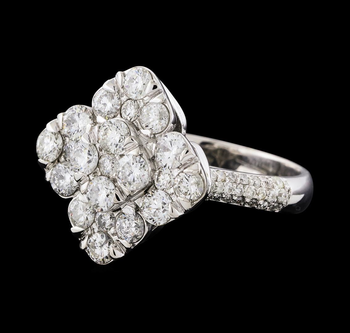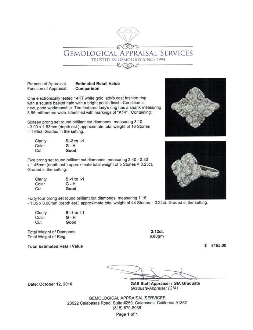 One electronically tested 14KT white gold lady's cast fashion ring with a square basket halo with a bright polish finish. The featured lady's ring has a shank measuring 3.85 millimeters wide. Identified with markings of 'K14'. Condition is new, good workmanship. Containing: Sixteen prong set round brilliant cut diamonds, measuring 3.10 - 3.00 x 1.83mm (depth est.) approximate total weight of 16 Stones = 1.65ct. Graded in the setting. Clarity SI-2 to I-1. Color: G - H Cut Good Five prong set round brilliant cut diamonds, measuring 2.40 - 2.30 x 1.46mm (depth est.) approximate total weight of 5 Stones = 0.25ct. Graded in the setting. Clarity SI-1 to I-1. Color: G - H Cut Good Forty-Four prong set round brilliant cut diamonds, measuring 1.15 - 1.05 x 0.68mm (depth est.) approximate total weight of 44 Stones = 0.22ct. Graded in the setting. Clarity SI-1 to I-1. Color: G - H Cut Good. Total Weight of Diamonds 2.12ct.. Total Weight of Ring 6.80gm. GAS Appraised at $6,155.00.