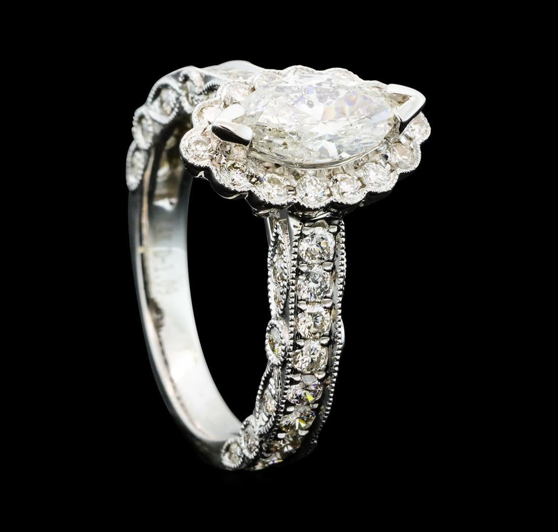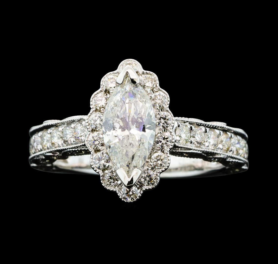 One electronically tested 14KT white gold lady's cast wedding ring with a scalloped basket halo with a bright polish with milgrain detailing finish. The featured lady's ring has a shank measuring 2.72 millimeters wide. Identified with markings of '14K'. Condition is new, good workmanship. Containing: One prong set marquise shaped cut diamond, measuring 10.10 x 5.11 x 3.13mm (depth est.) , 10.00.%. GTCF approximate weight of 1.03ct. Graded in the setting. Clarity I-1. Color: G - H Cut Very Good Eighteen prong set round brilliant cut diamonds, measuring 2.00 - 1.90 x 1.21mm (depth est.) approximate total weight of 18 Stones = 0.52ct. Graded in the setting. Clarity SI-1 to SI-2. Color: H - I Cut Very Good Thirty-Four prong set round brilliant cut diamonds, measuring 1.60 - 1.40 x 0.93mm (depth est.) approximate total weight of 34 Stones = 0.43ct. Graded in the setting. Clarity SI-1 to SI-2. Color: G - H Cut Very Good Thirty-Six prong set round brilliant cut diamonds, measuring 1.10 - 1.00 x 0.63mm (depth est.) approximate total weight of 36 Stones = 0.14ct. Graded in the setting. Clarity SI-1 to SI-2. Color: H - I Cut Very Good. Total Weight of Diamonds 2.12ct.. Total Weight of Ring 4.50gm. GAS Appraised.